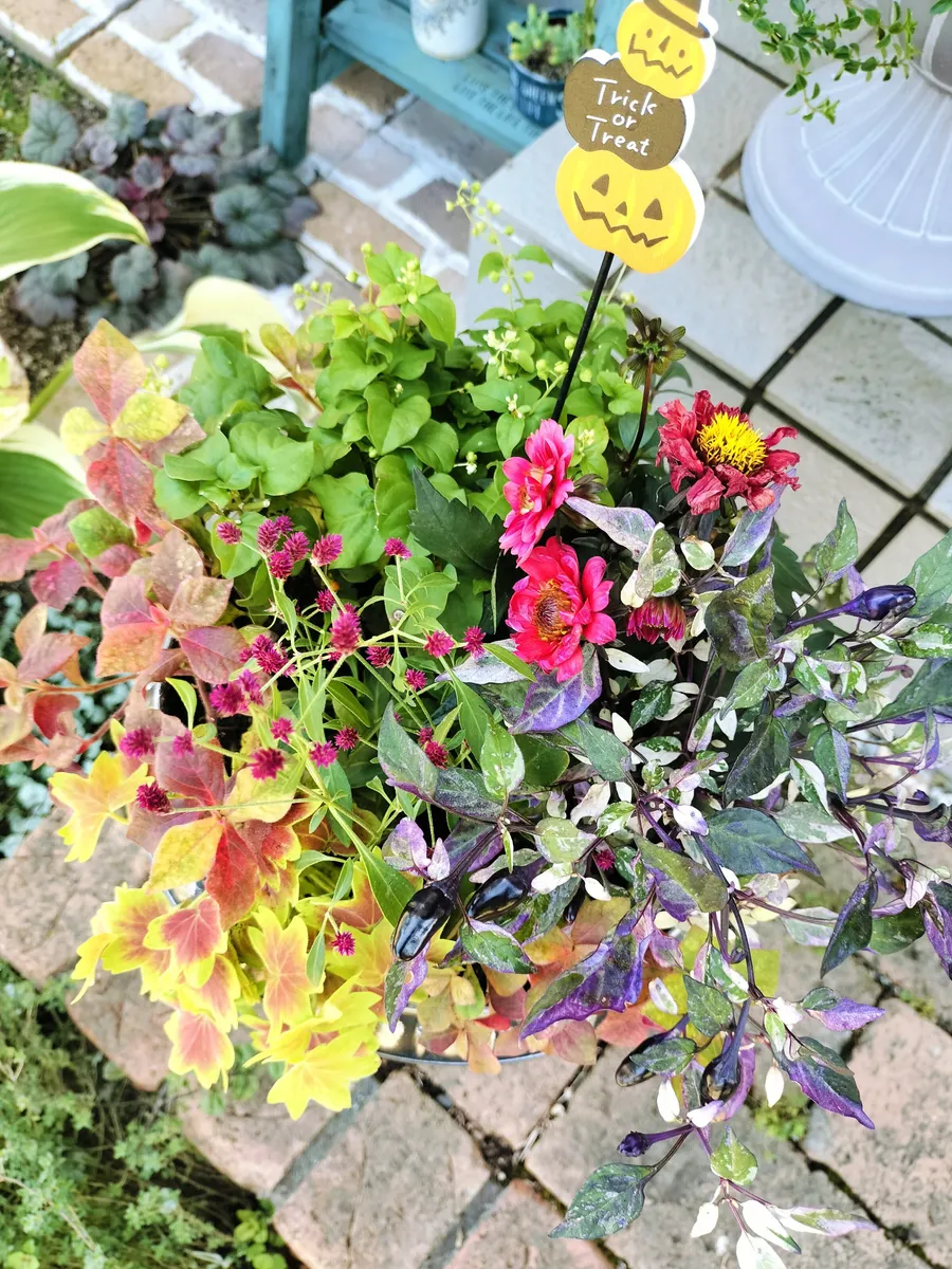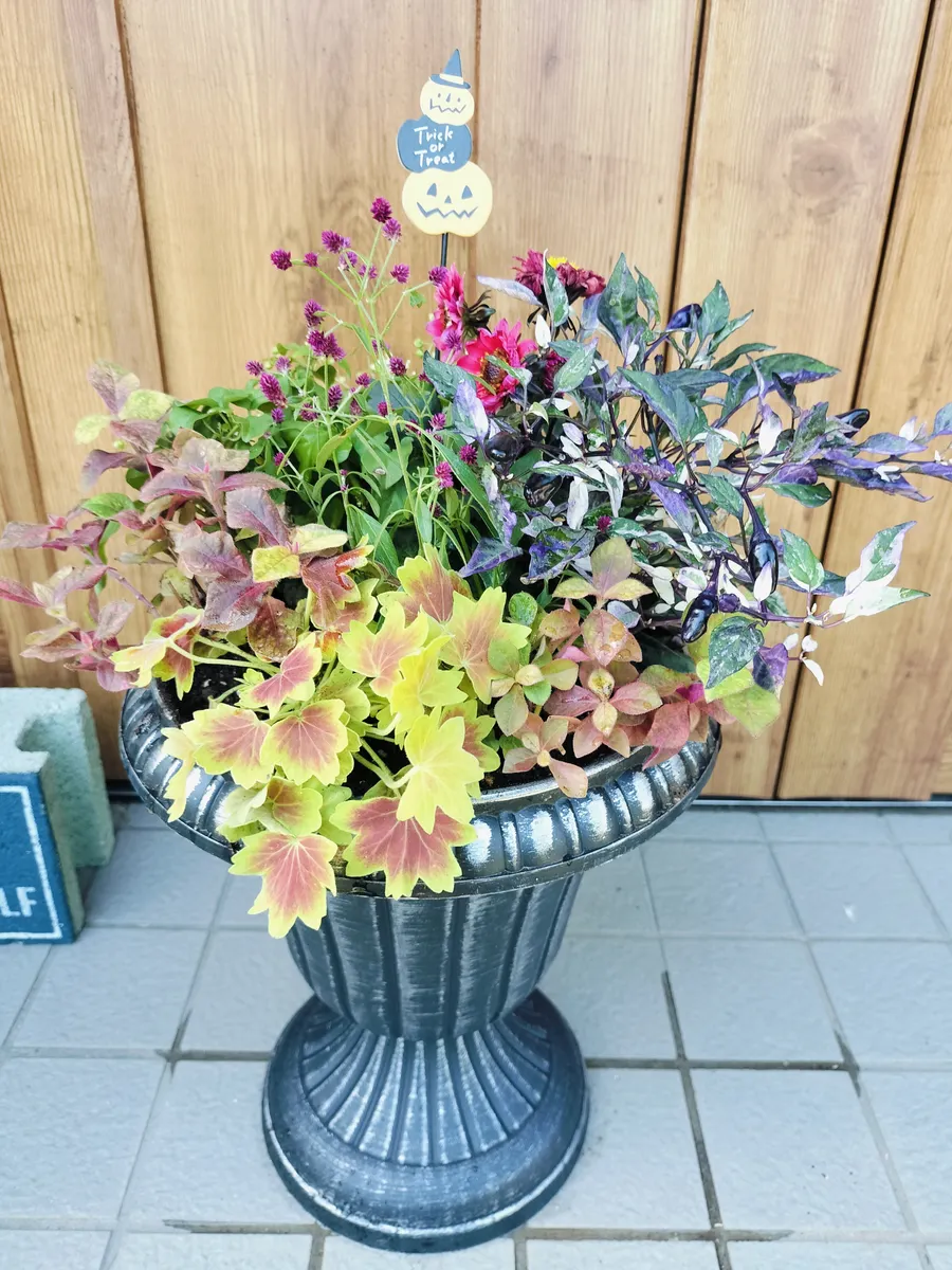 ハロウィンにピッタリのダークな鉢に、これまた良い雰囲気の葉物た〜くさん!よくこんなに入りましたね😆🙌長持ちしてくれるといいですね😉💕