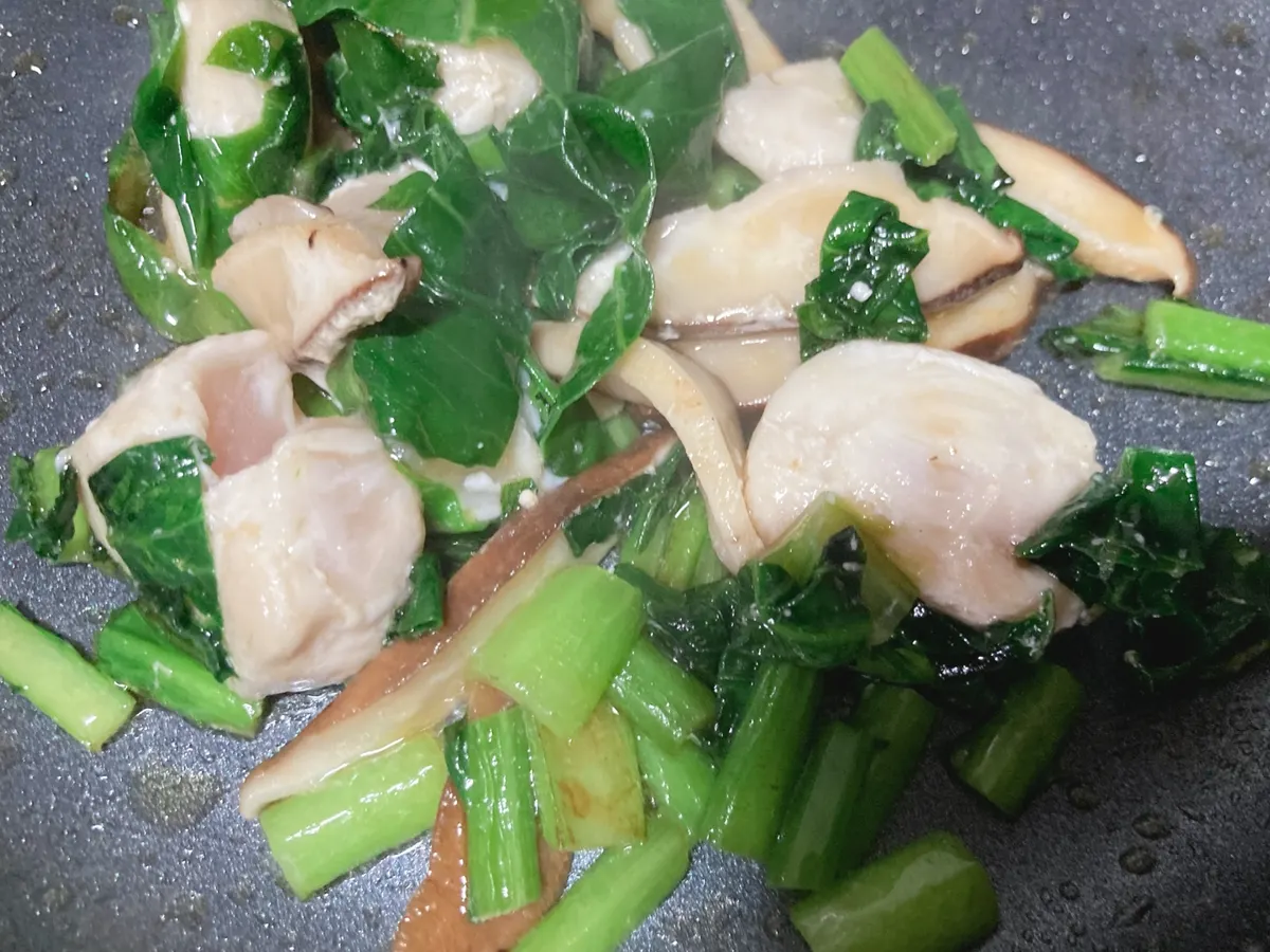 ⑤水、醤油、白だし、片栗粉を入れた材料を野菜を炒めたフライパンに入れて 混ぜながら加熱する