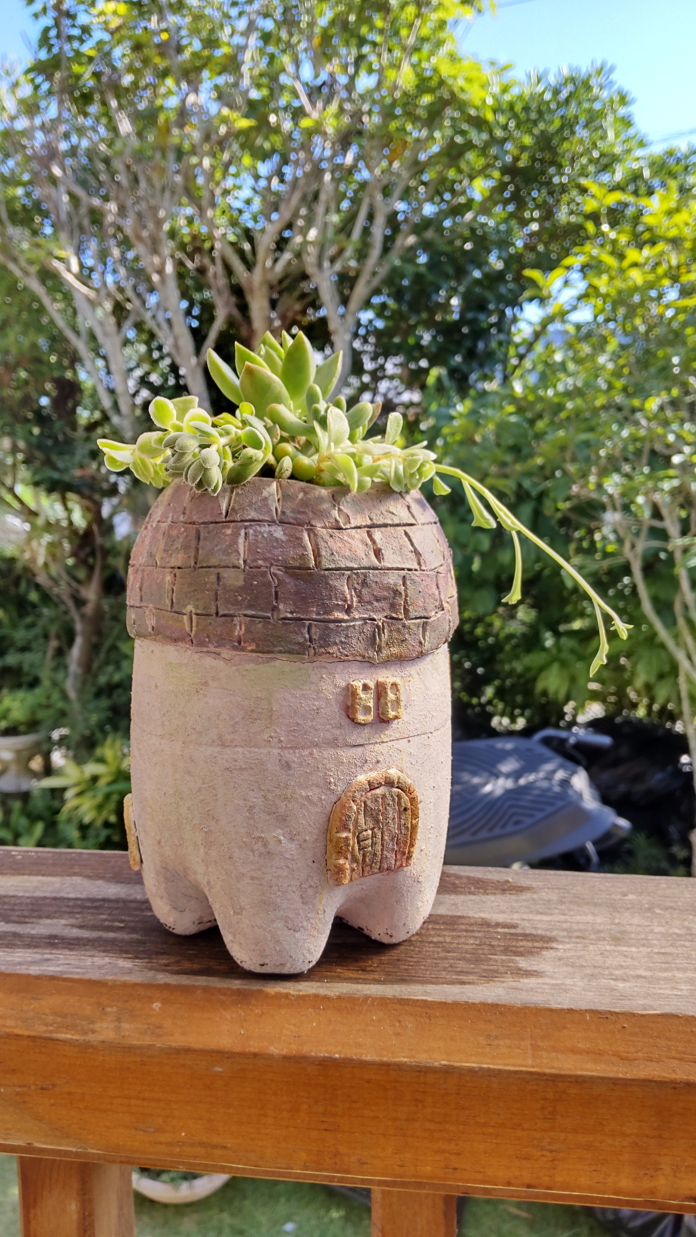 違っていたらゴメンナサイですが、この鉢は、もしや手作り? ペットボトルを切って、粘土(モルタル?)を貼り付けて作ったとか…?? なんにせよ、鉢と多肉が合っていて可愛いです😍❤️