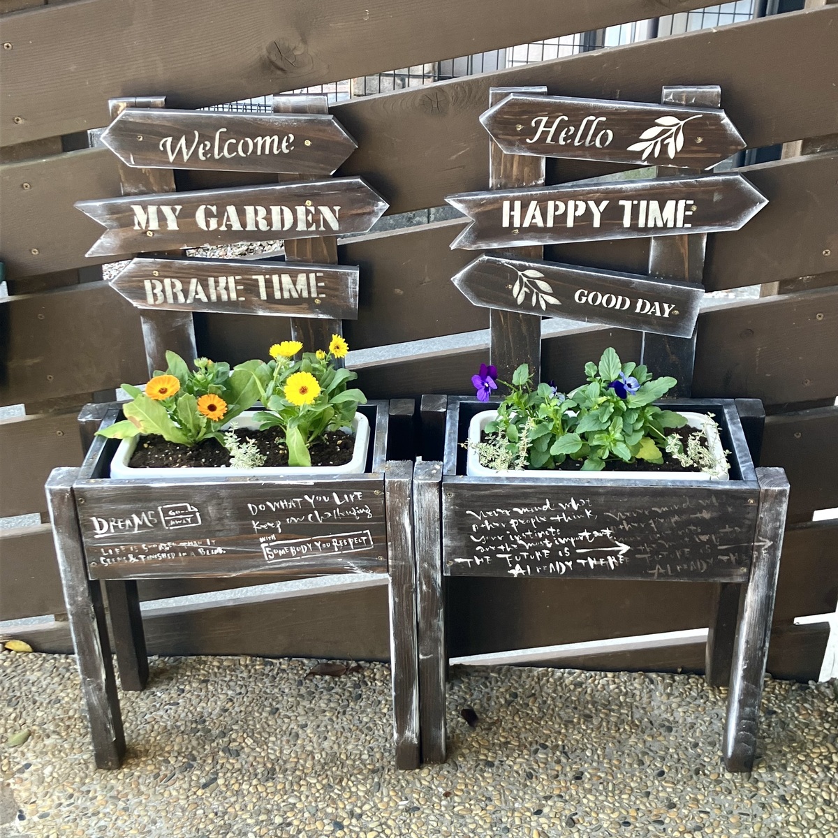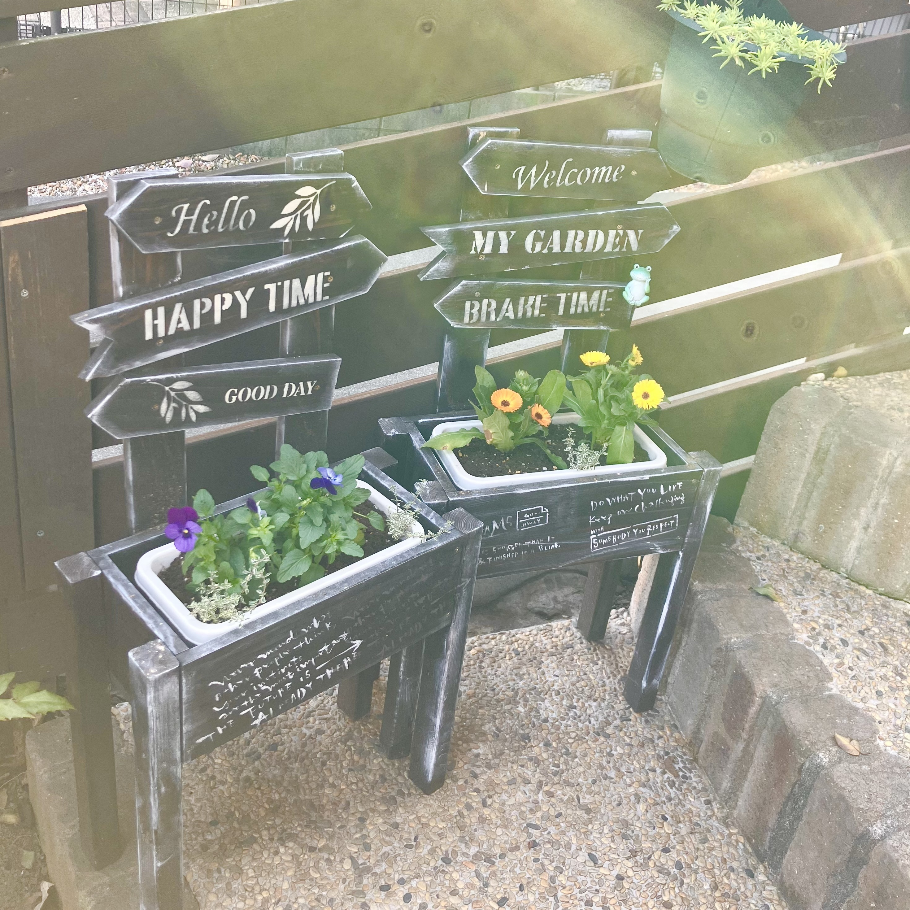 ガーデンサインプランターの風合い素敵です。脚も付けられて、お花に優しくなりますね✨