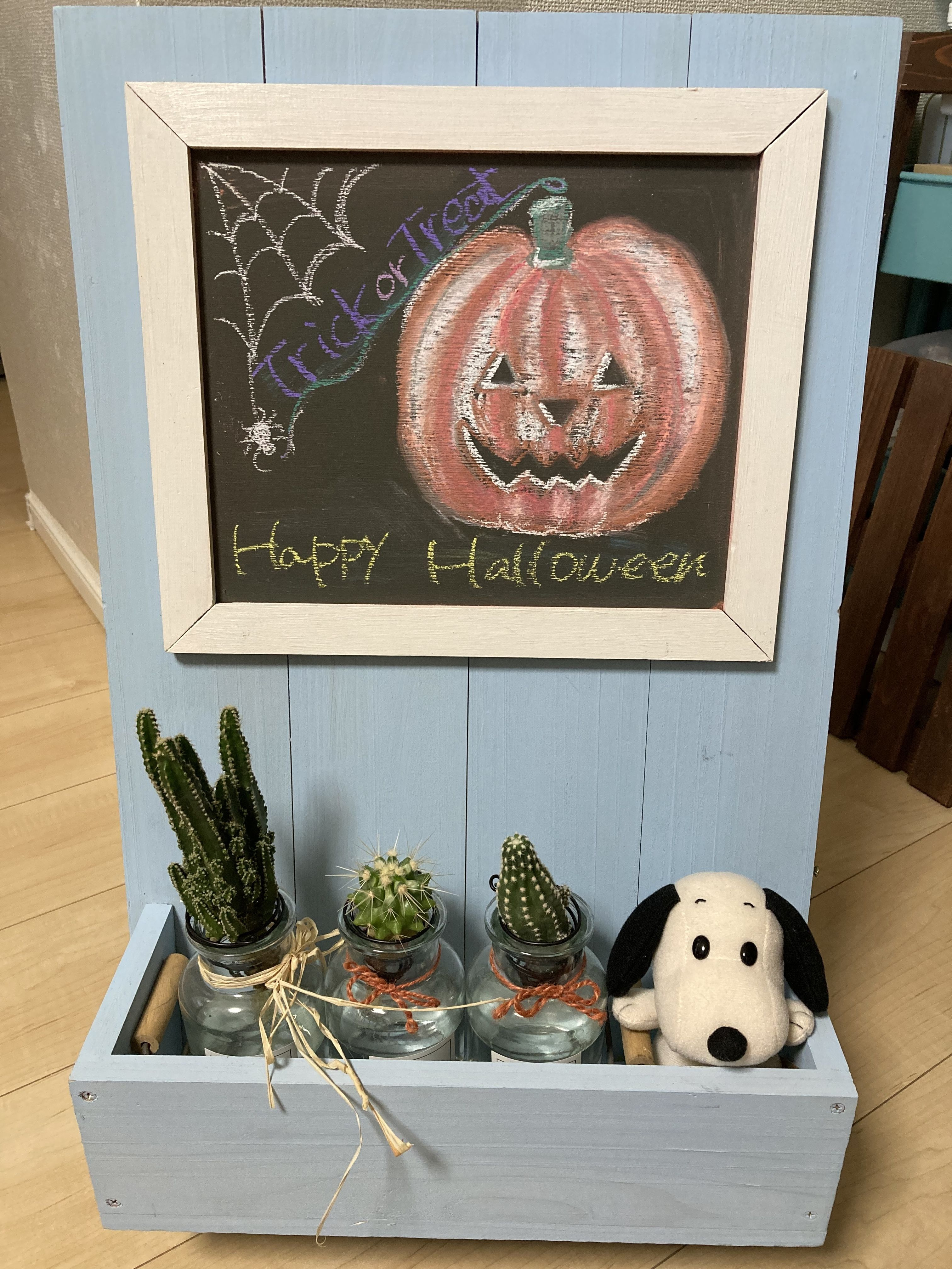 少し前に購入したチョークで以前作った黒板付きフラワースタンドにハロウィン🎃のチョークアートしてみました🎃🦇🕸