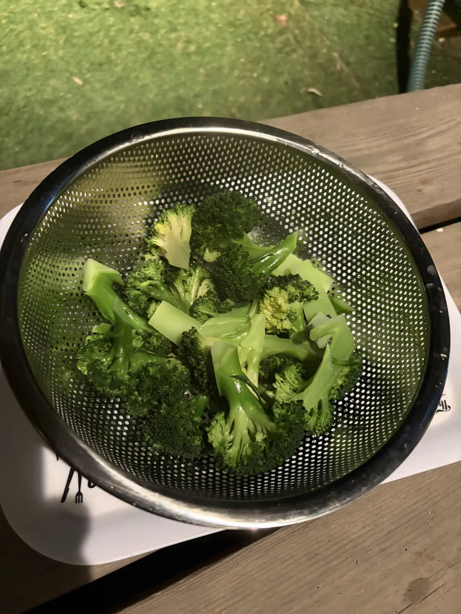 ①ブロッコリーは食べやすい大きさにカットして茹で、ザルにあげて外に放り出して冷ます。