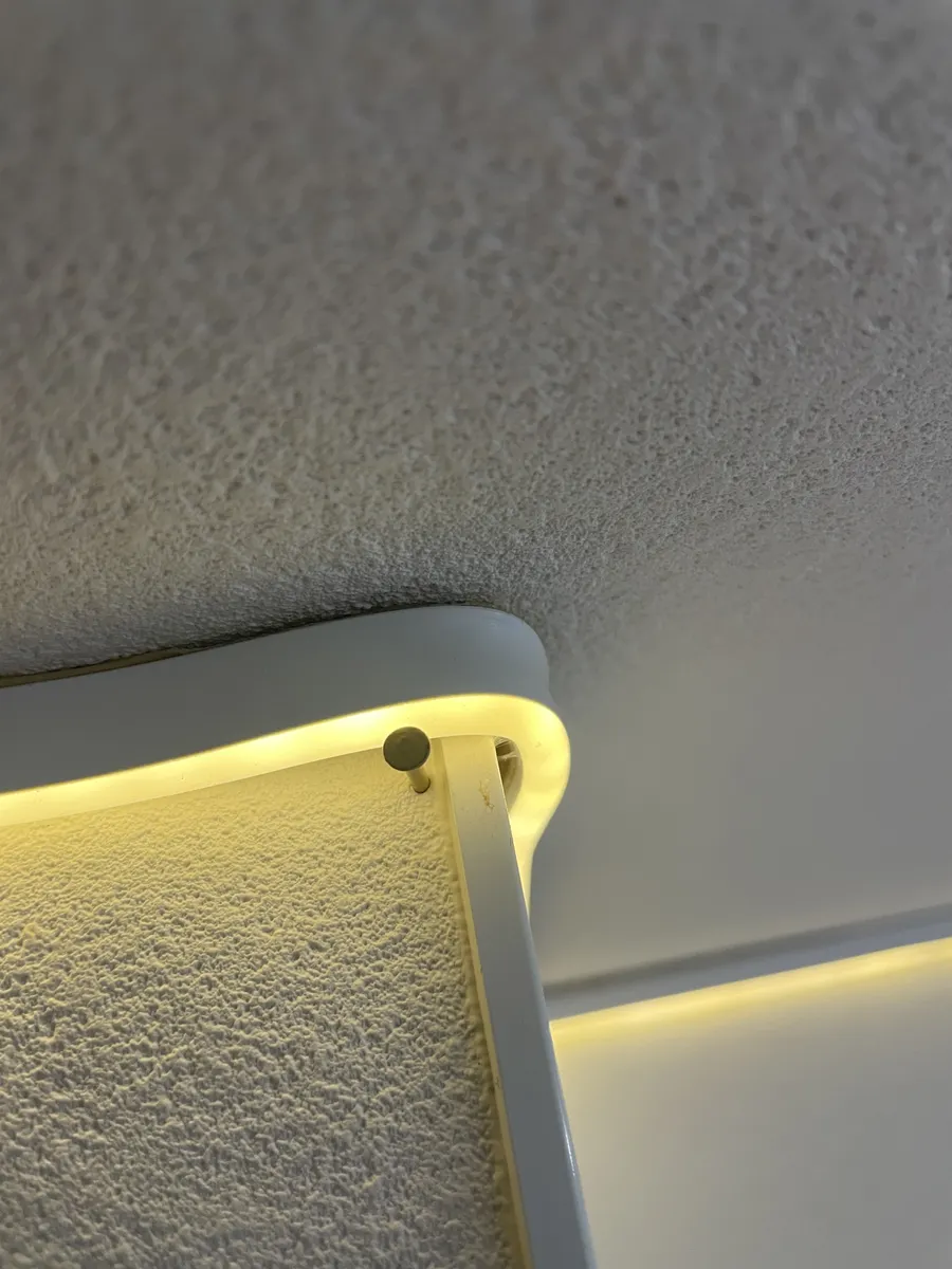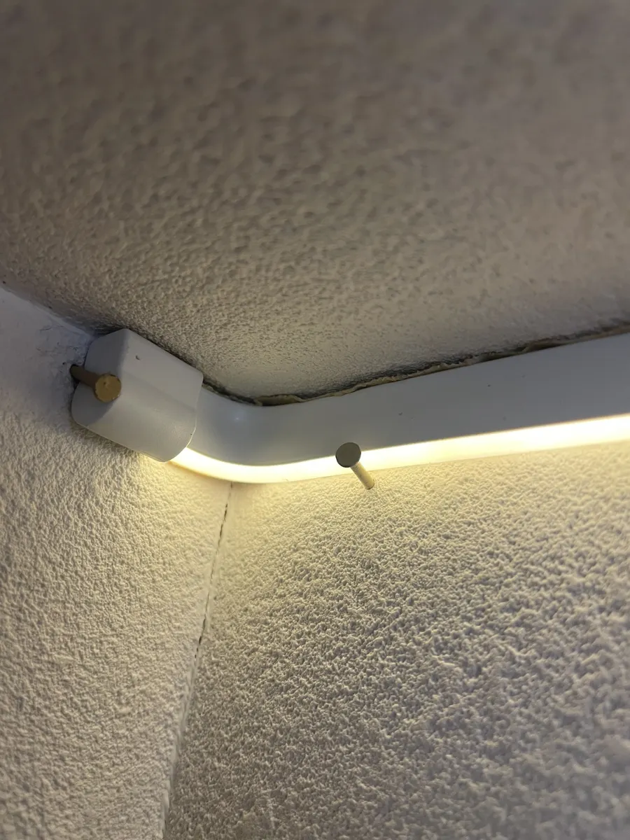 剥がれ落ちそうな所にだけ落下防止のサポートとして小さな釘を何箇所か打ちました。この写真をよく見るとLEDテープの上面に両面テープが見えますね。勿論背面にもテープで貼り付けしてます。