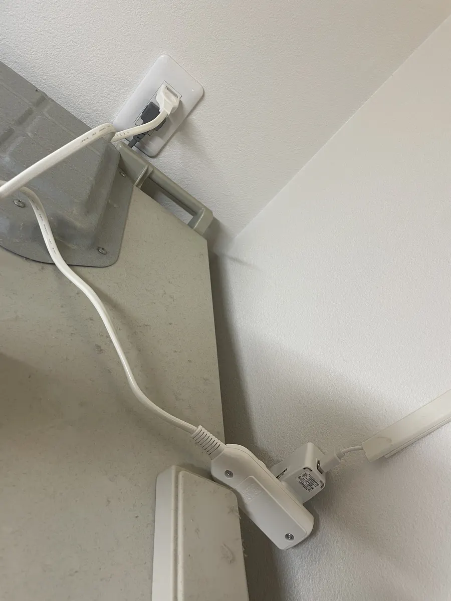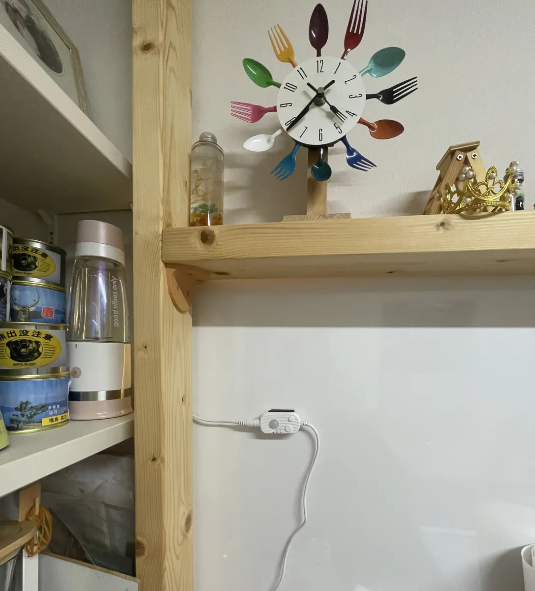 電源はこんな感じで冷蔵庫上のコンセントに接続してます。バッテリー式では無いので充電する手間が省けて楽チンです。