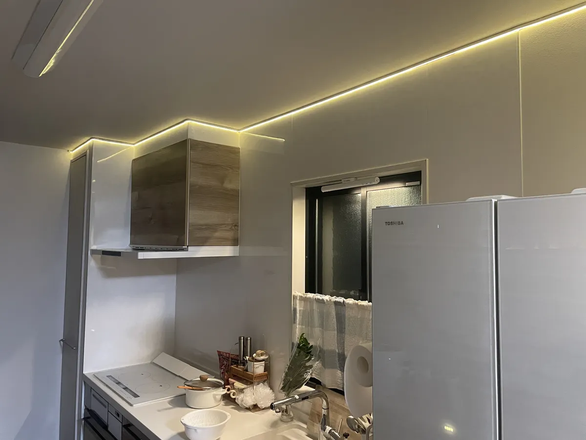 この両面テープの幅が広いので半分にカットしてもLEDテープの背面と天井に付く部分もカバー出来ました