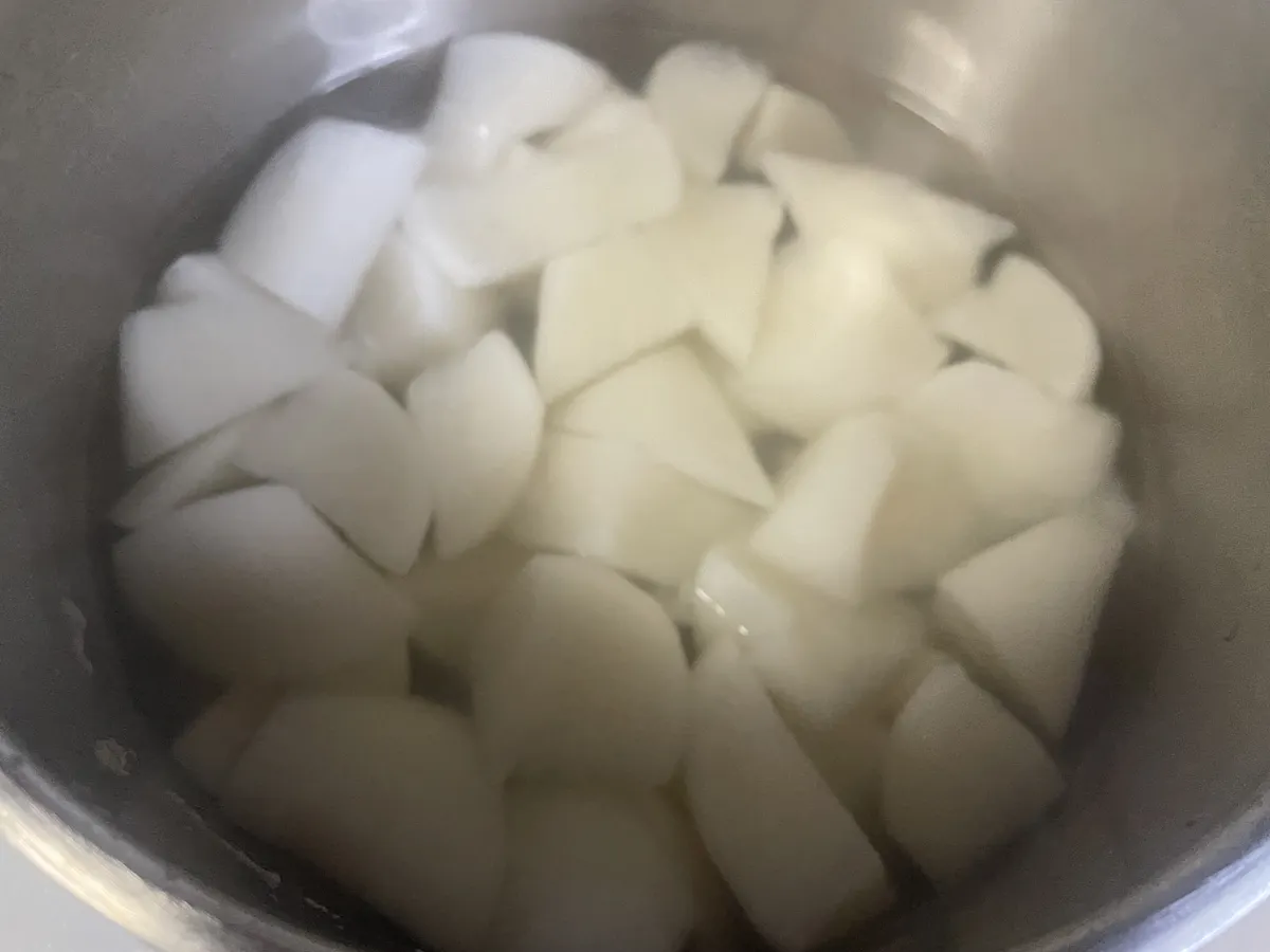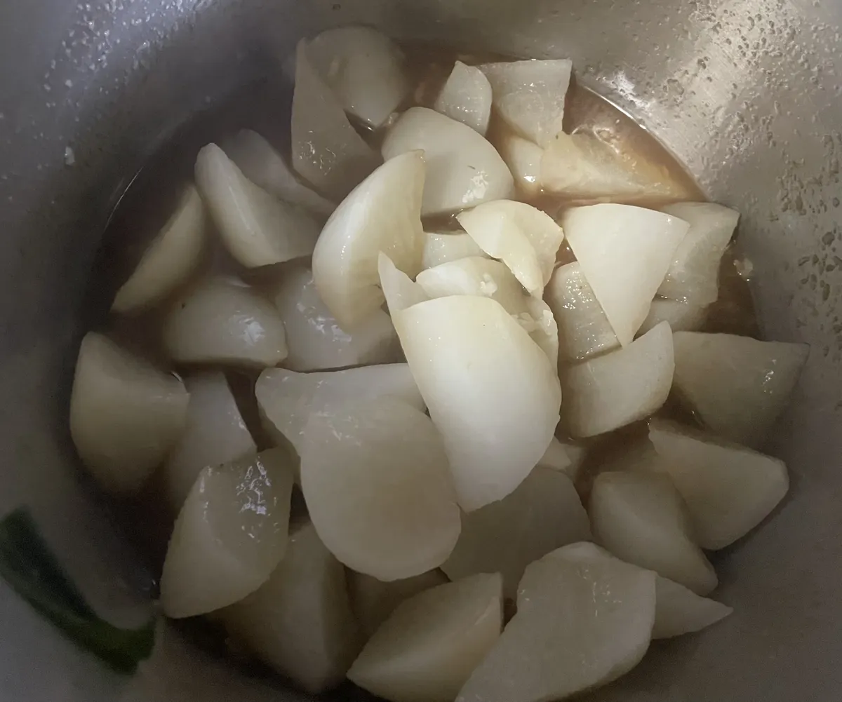 初手は大根を圧力鍋で材料①の胴部分・米チョイで煮とくところからぁ〜😁👍🤍🌾🔥✨