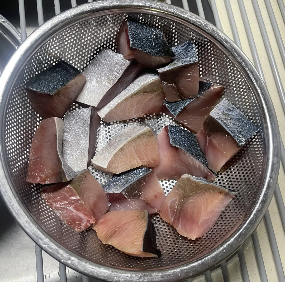 その間に鰤切身を3当分に切ったものを出来るだけ重ならない様、ザルにセットしといてぇ〜🐟🔪➰🕸️✨