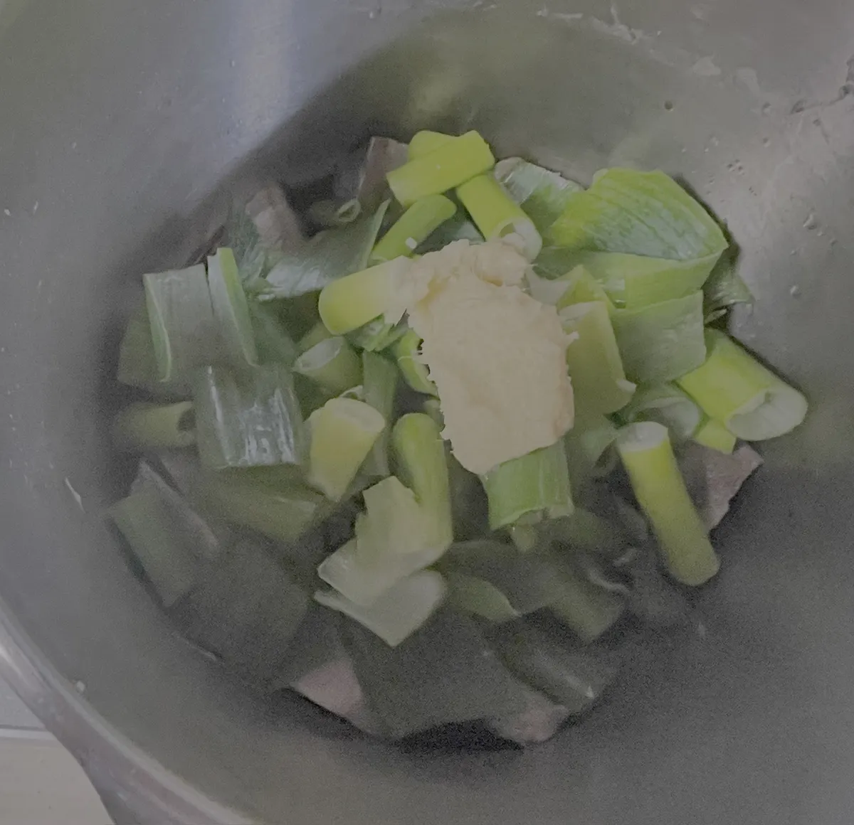 材料②の鰤・葱青身と調味料①全てを入れ煮立たせるぅ〜🐟💚🍶🫚➰🍲🔥✨
