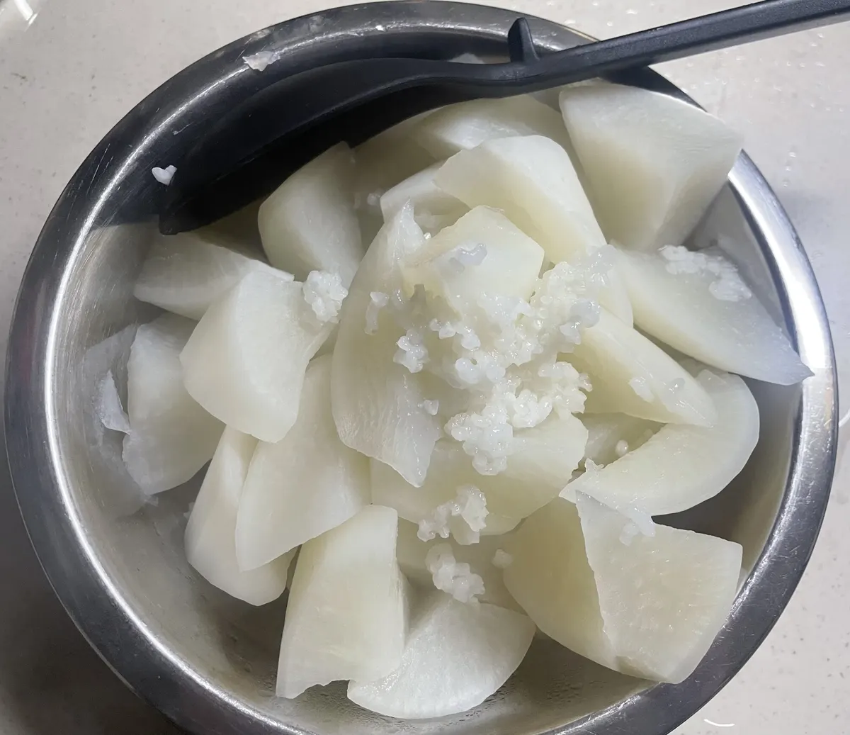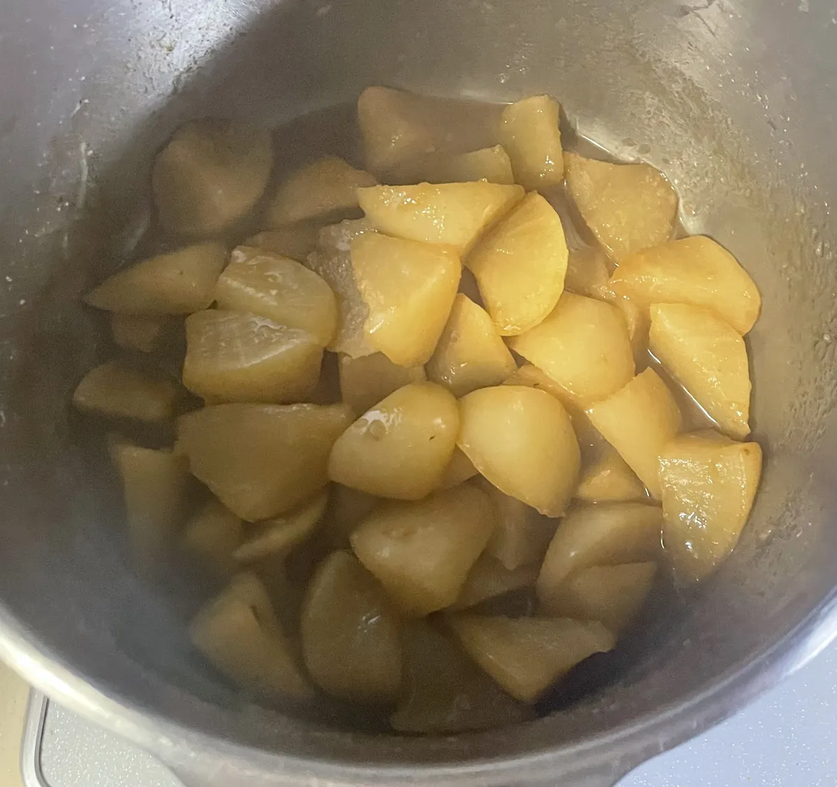 ・大根の下茹で、本来なら米の研ぎ汁でエエんだけど我が家無洗米利用なんでチョイ摘みっくらいの量で良いからコレで下茹でしとくと、デカい乱切りで食べたい大根も味入れる段階で優しい且つ味の沁み込み早い調理が出来るんだよなぁ〜😋🤍➡️🤎🔜✨
