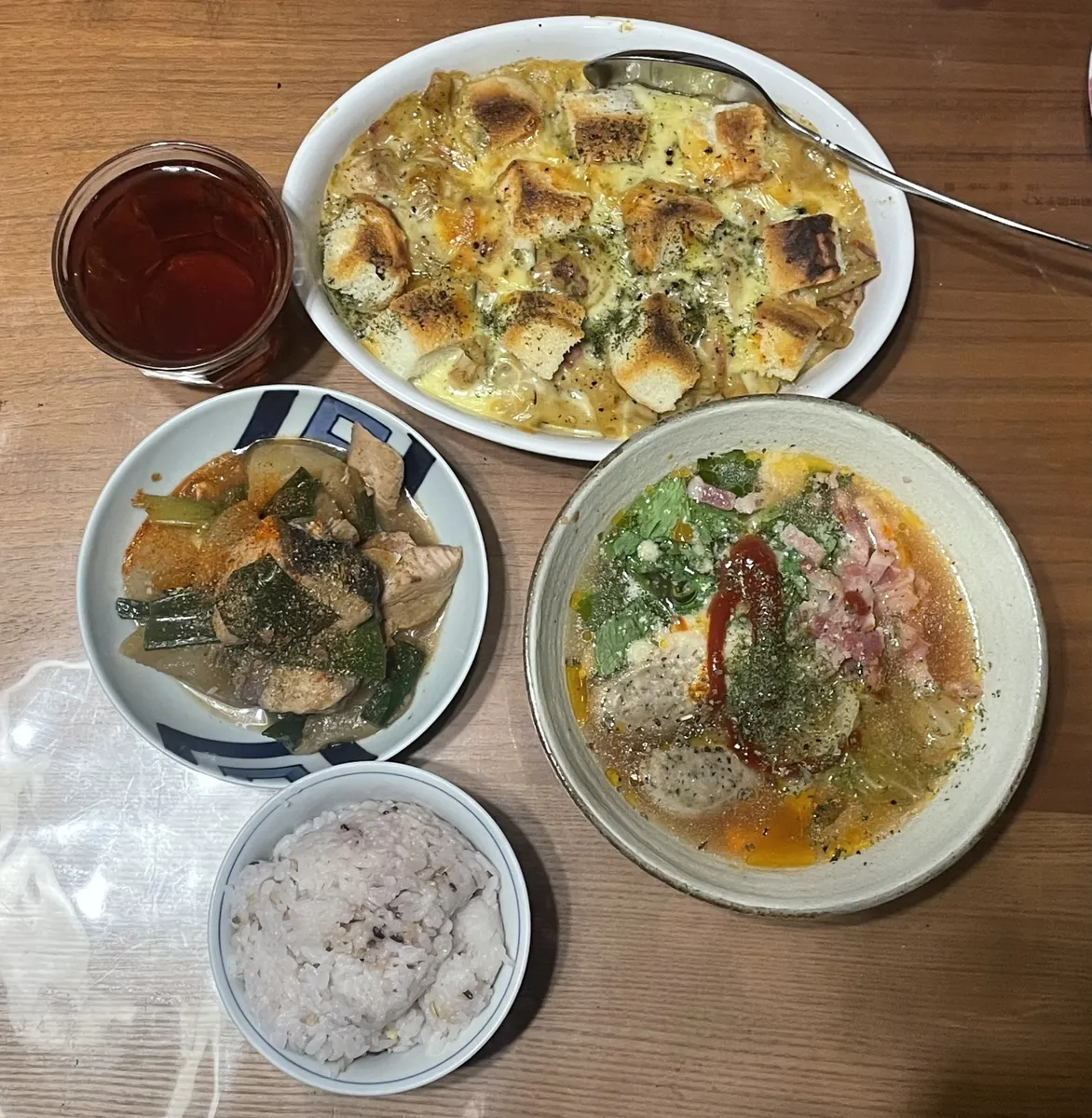 この日のその他ラインナップは、繋ぎもの半額南瓜パングラタン・並行して別途作ってた半額キャベツの生ハーブのウインナー&お買得品ベーコンやらのトマトコンソメスープ🤣🙌🉐🏹✨