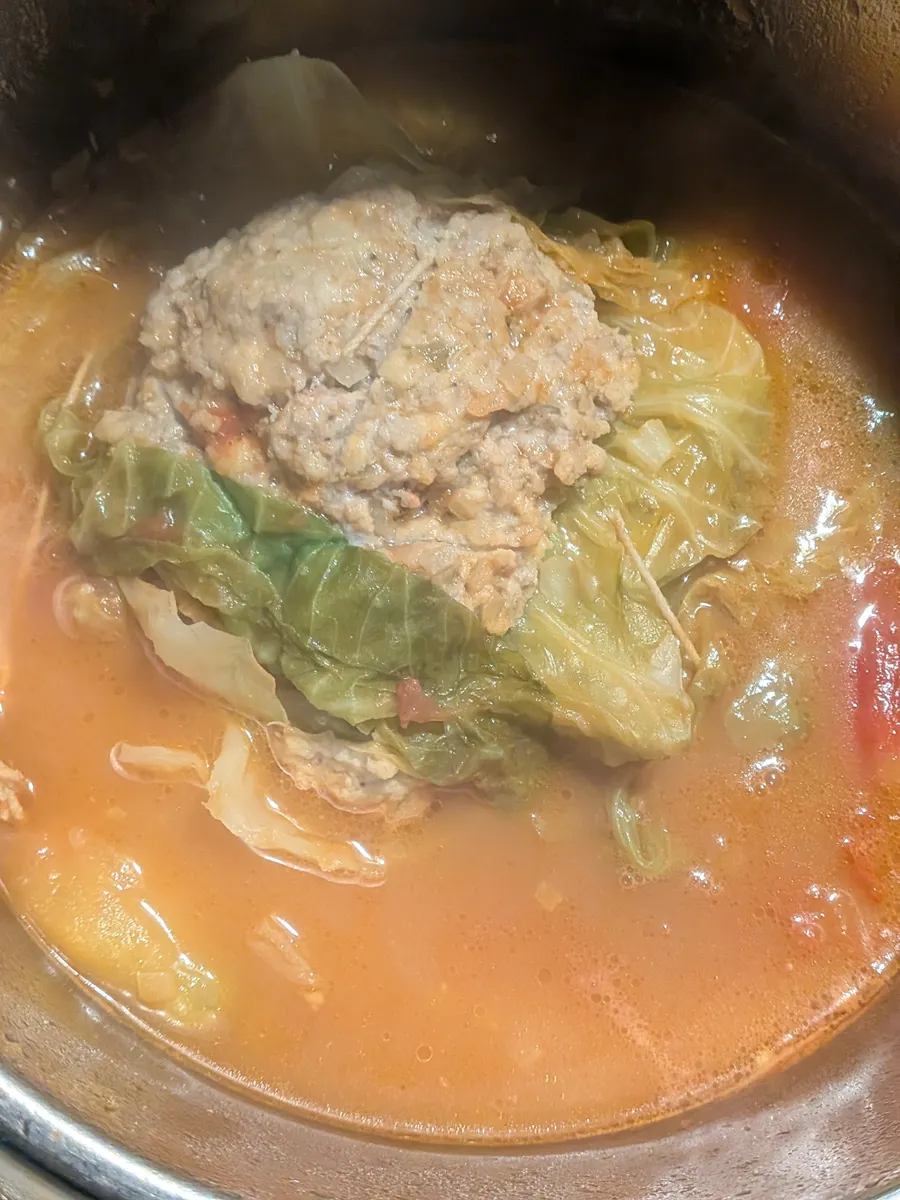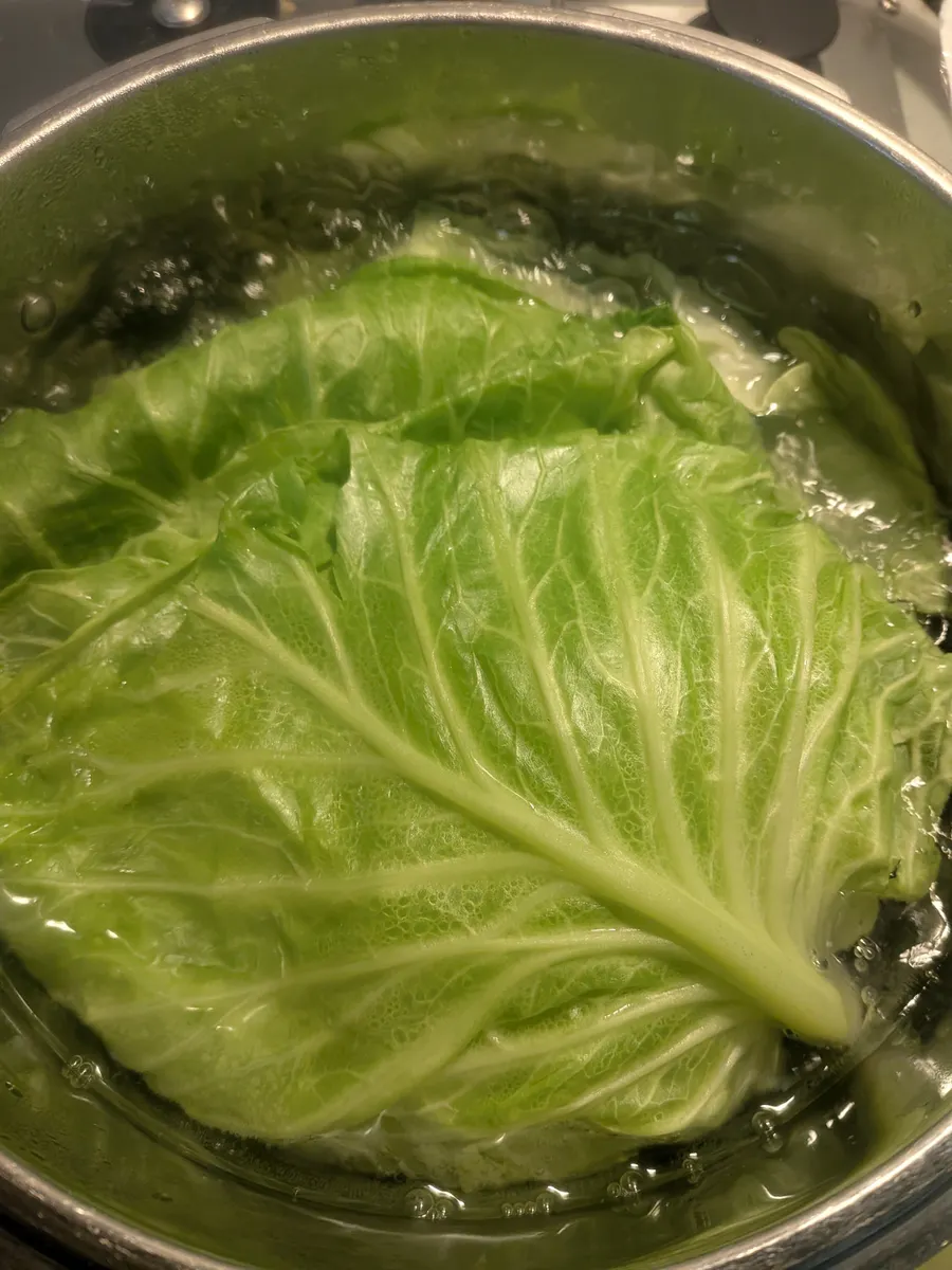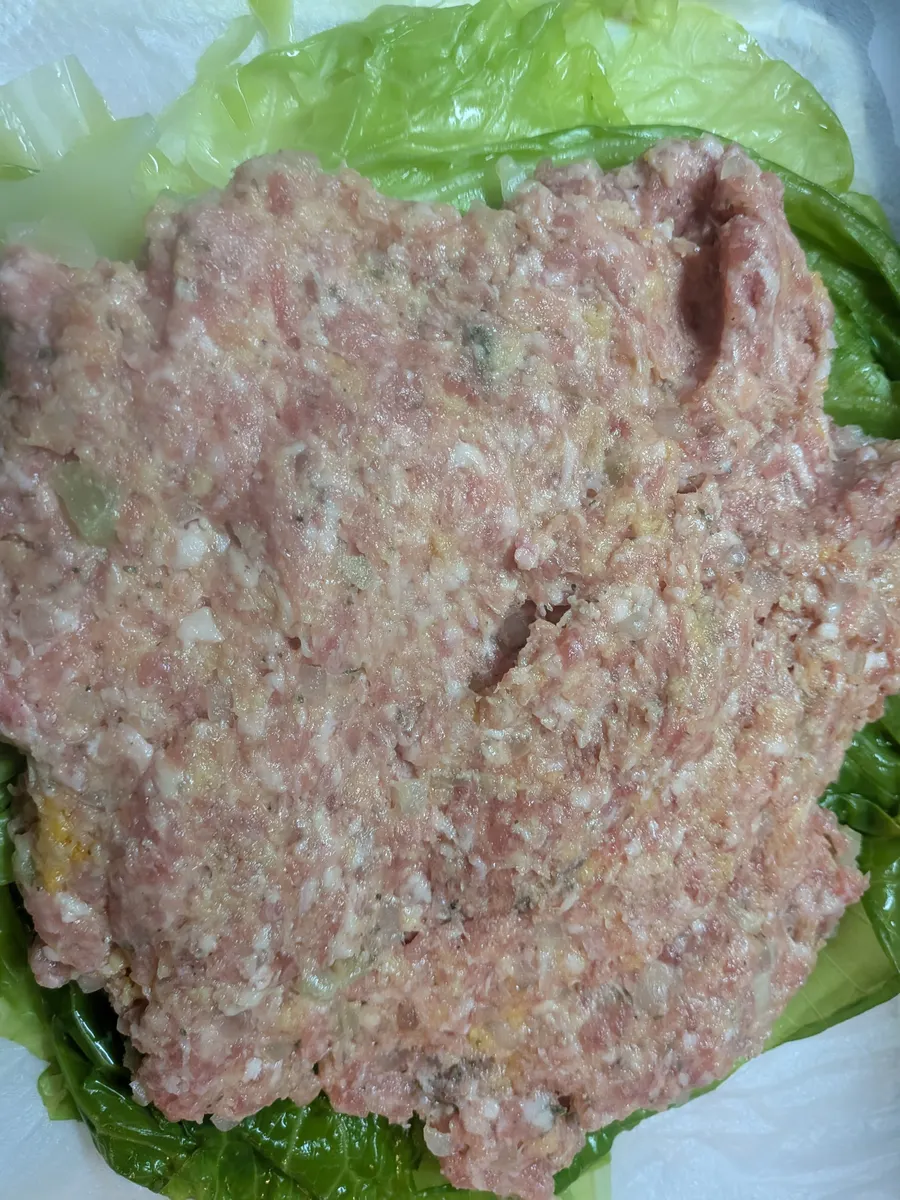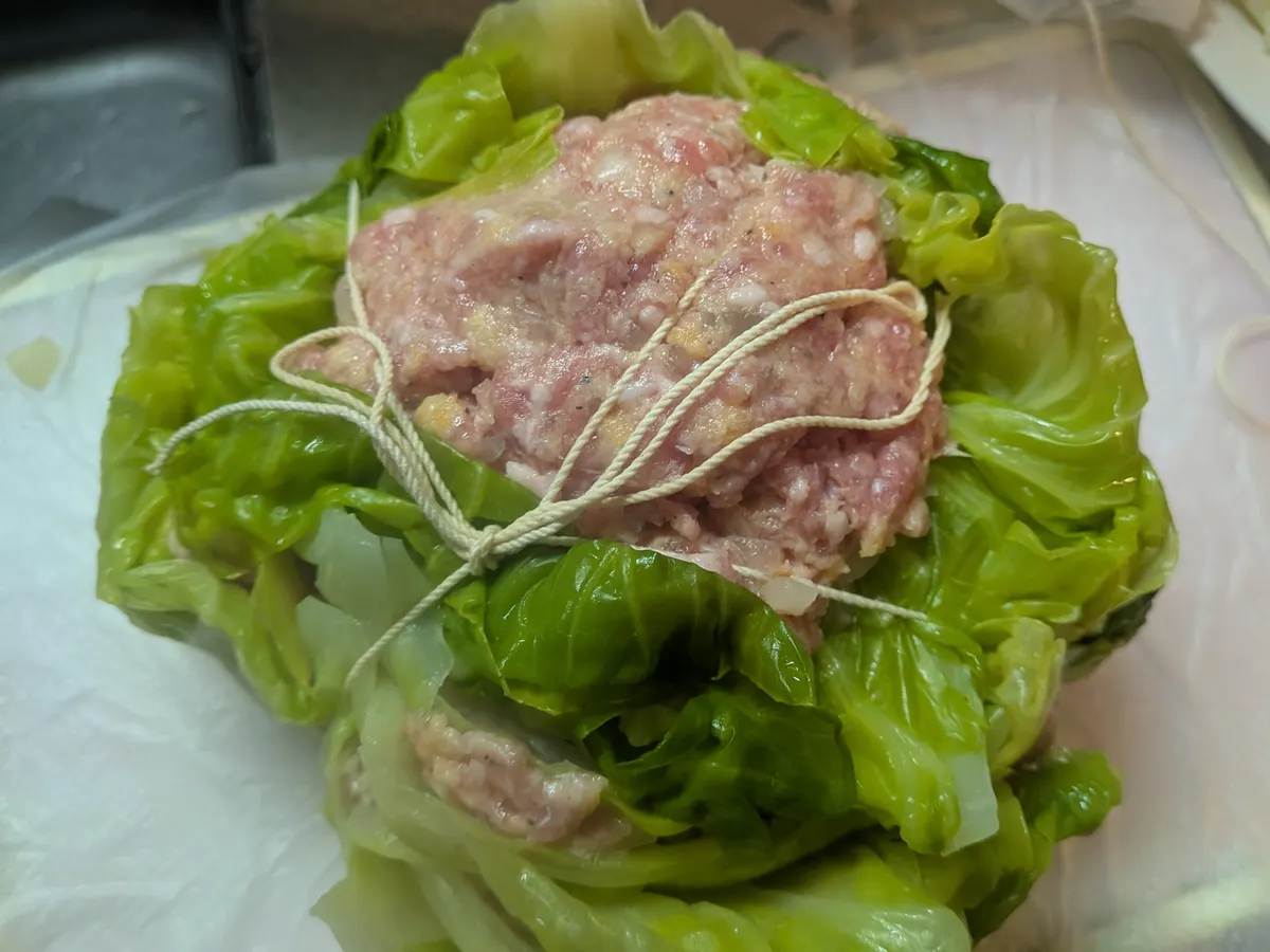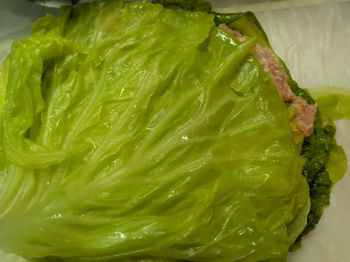 ⑤さらにキャベツを広げて③の半分を伸ばす。もう1度キャベツを広げて残りを丸めてのせる。