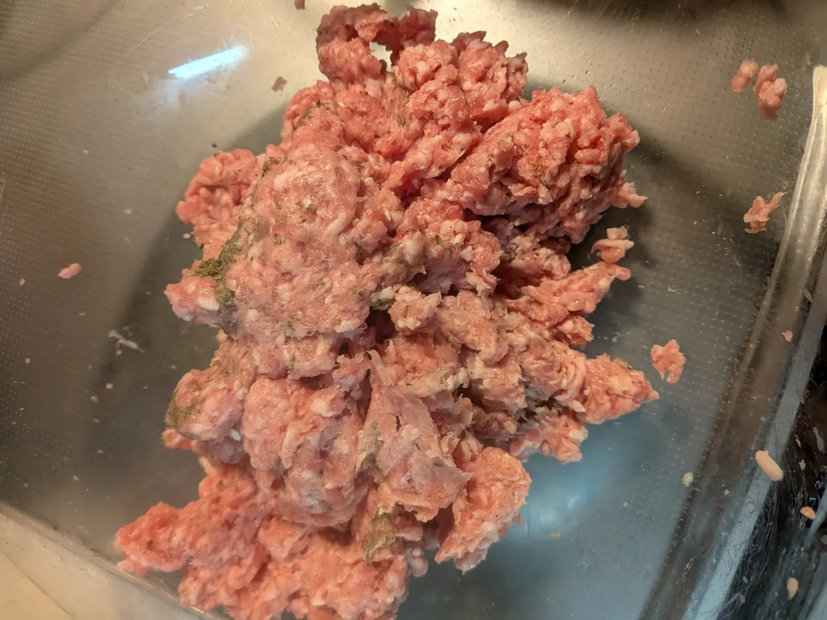 ③ひき肉に塩とスパイスを混ぜ、粘り気がでるまでこねる。