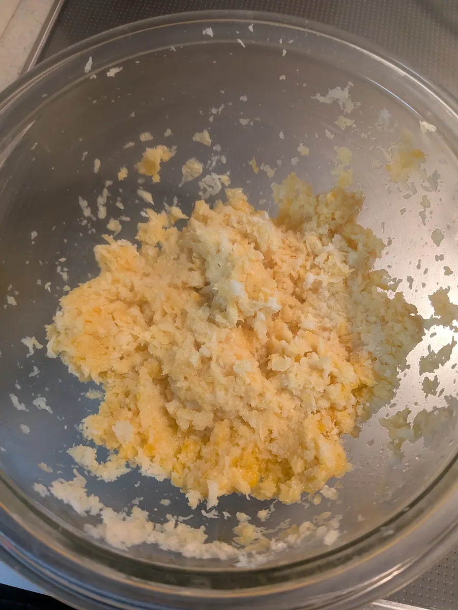 ②パン粉に玉子と牛乳を混ぜる。玉ねぎと①のそぎ切りしたキャベツの芯をみじん切りにする。