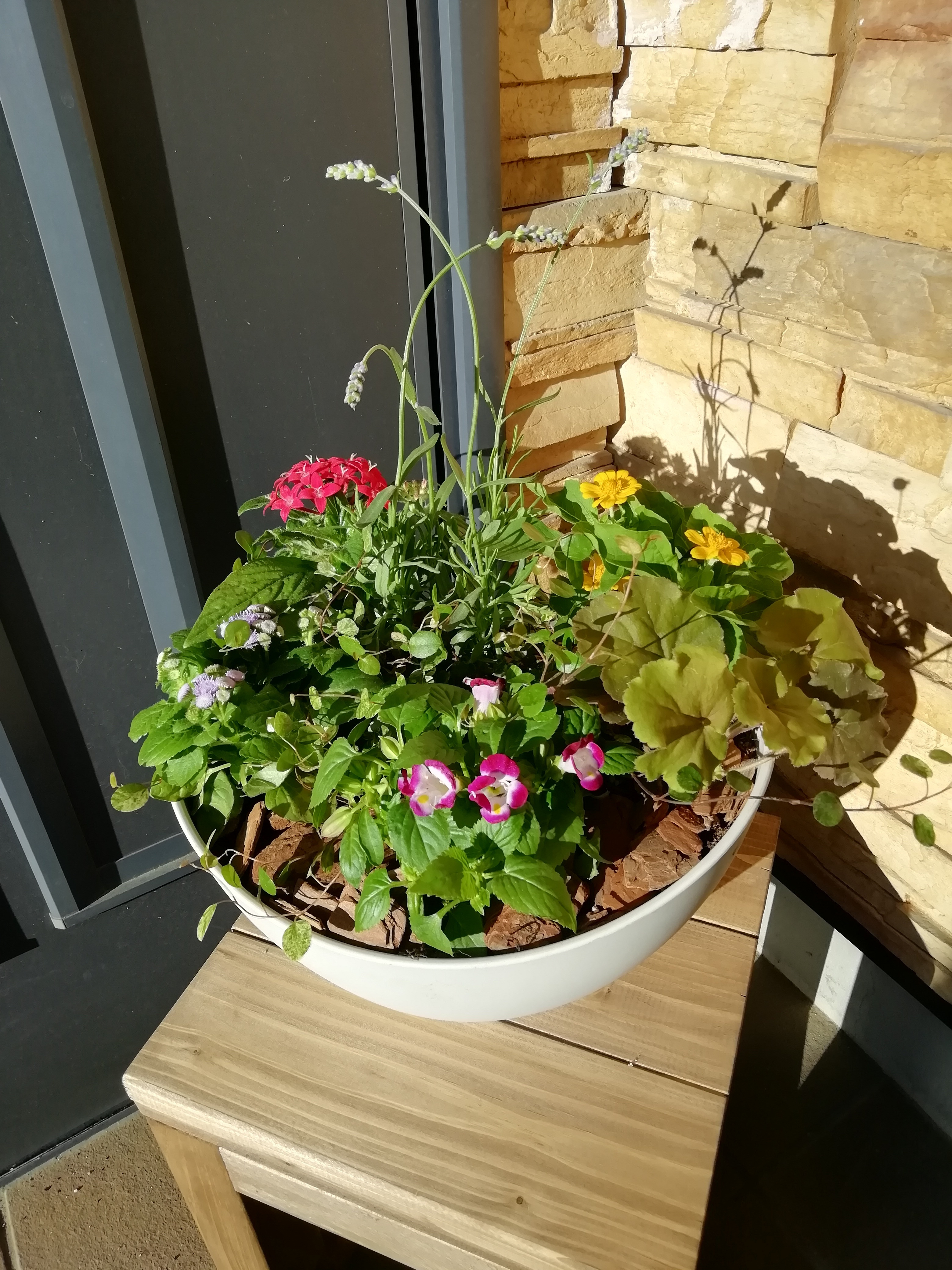 ポットのヘリが波うっているので一番低い所にウオータスポットを考えながらラベンダーを配置他のお花達をバランスよく位置決めあなたの一番可愛い正面はどこ~