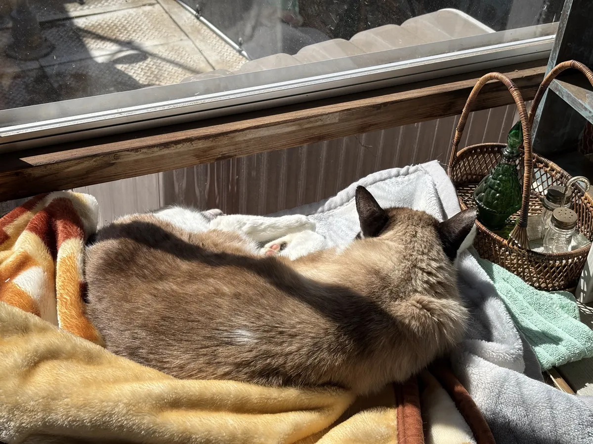 シャワーのあとの日向ぼっこ、ここちよさそうですねぇ(人´ω`)