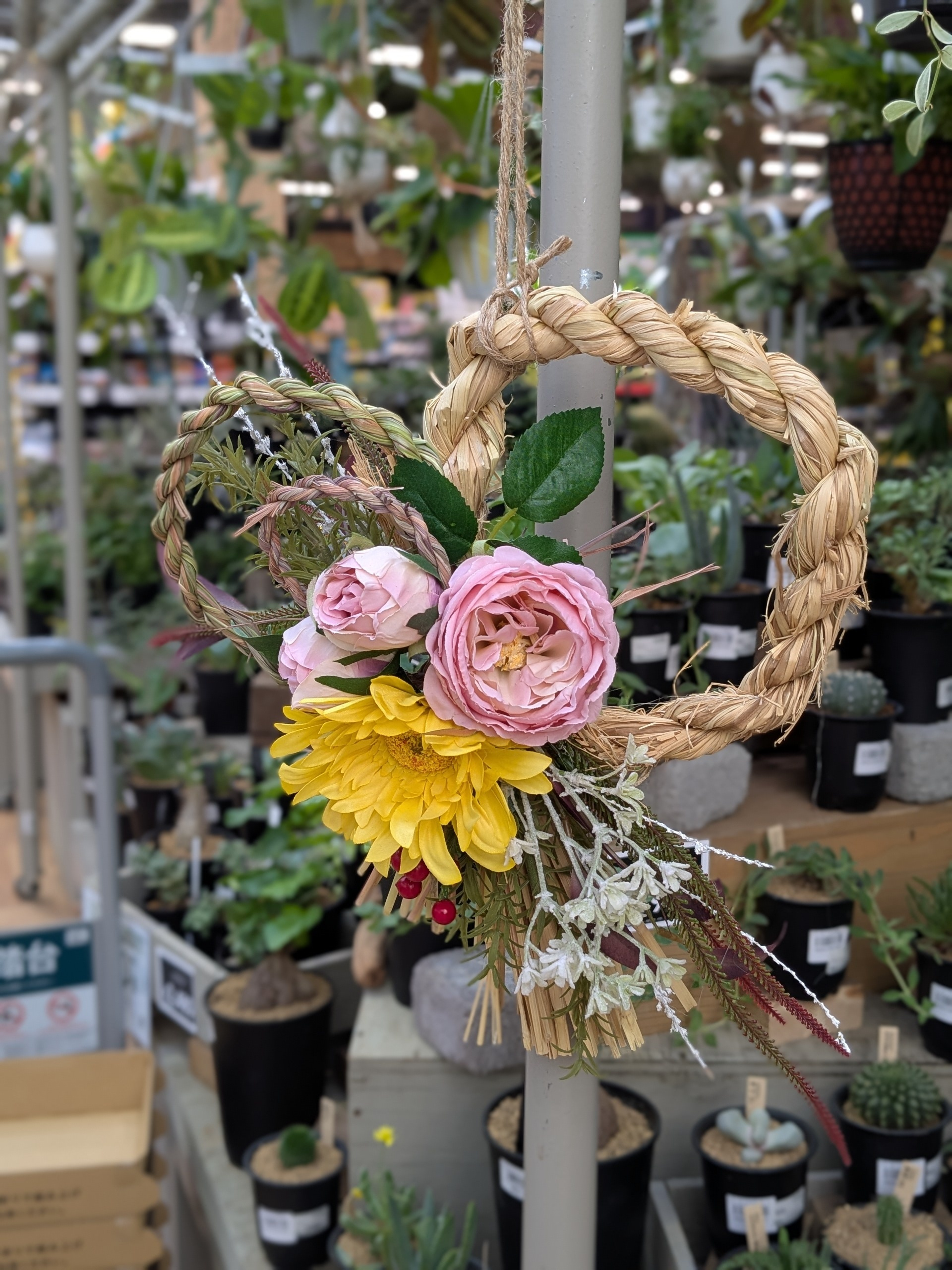 投稿を表示わらとレモングラスの縄なんですね。縄からの香りと、華やかなお花からの、2つの香りも楽しめて、素敵なお正月飾りですね❣️