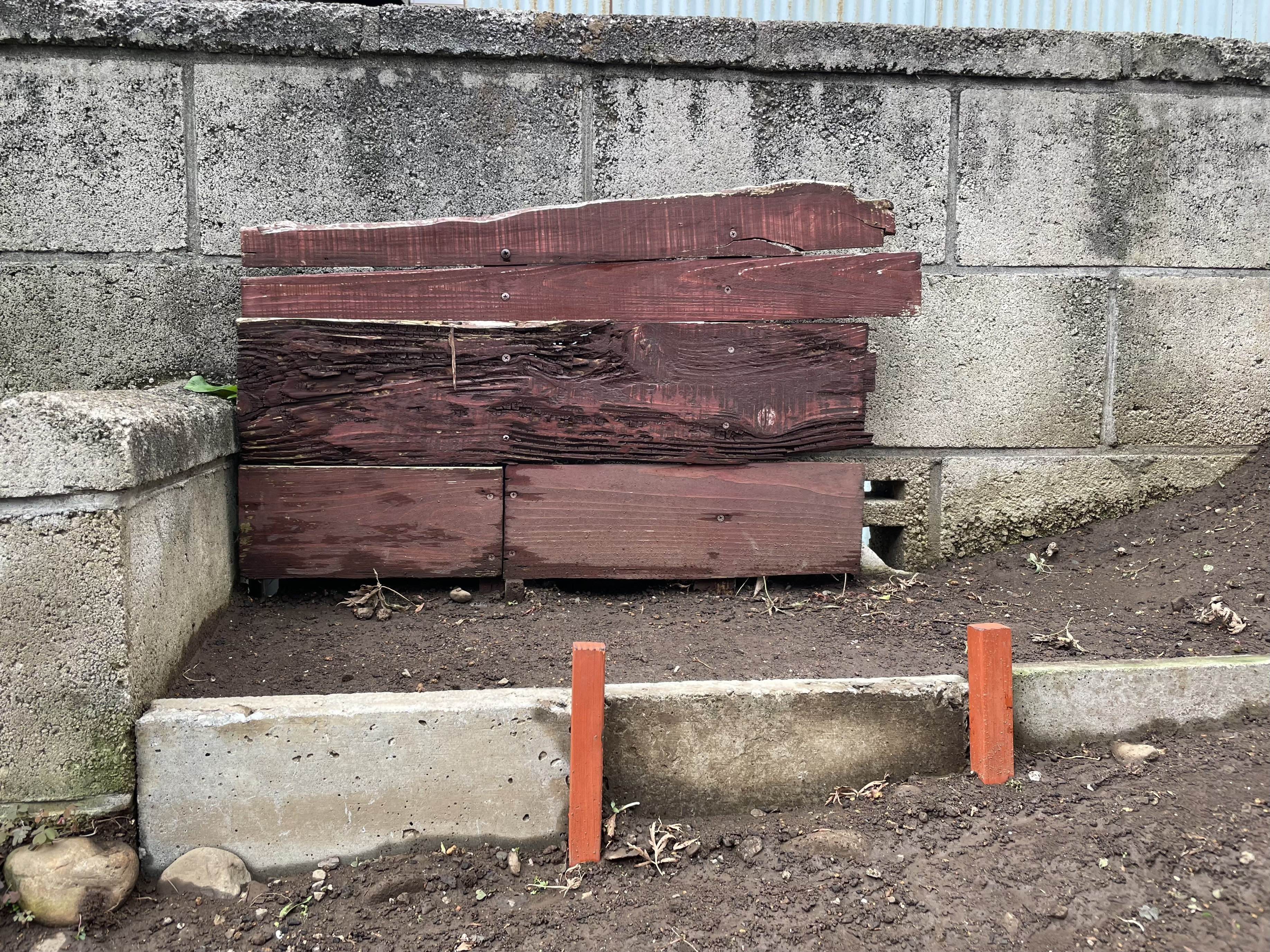 ストッパーにしてた板材も朽ちてきたので、手持ちのコンクリ板に差し替えて杭で固定する事にしました。