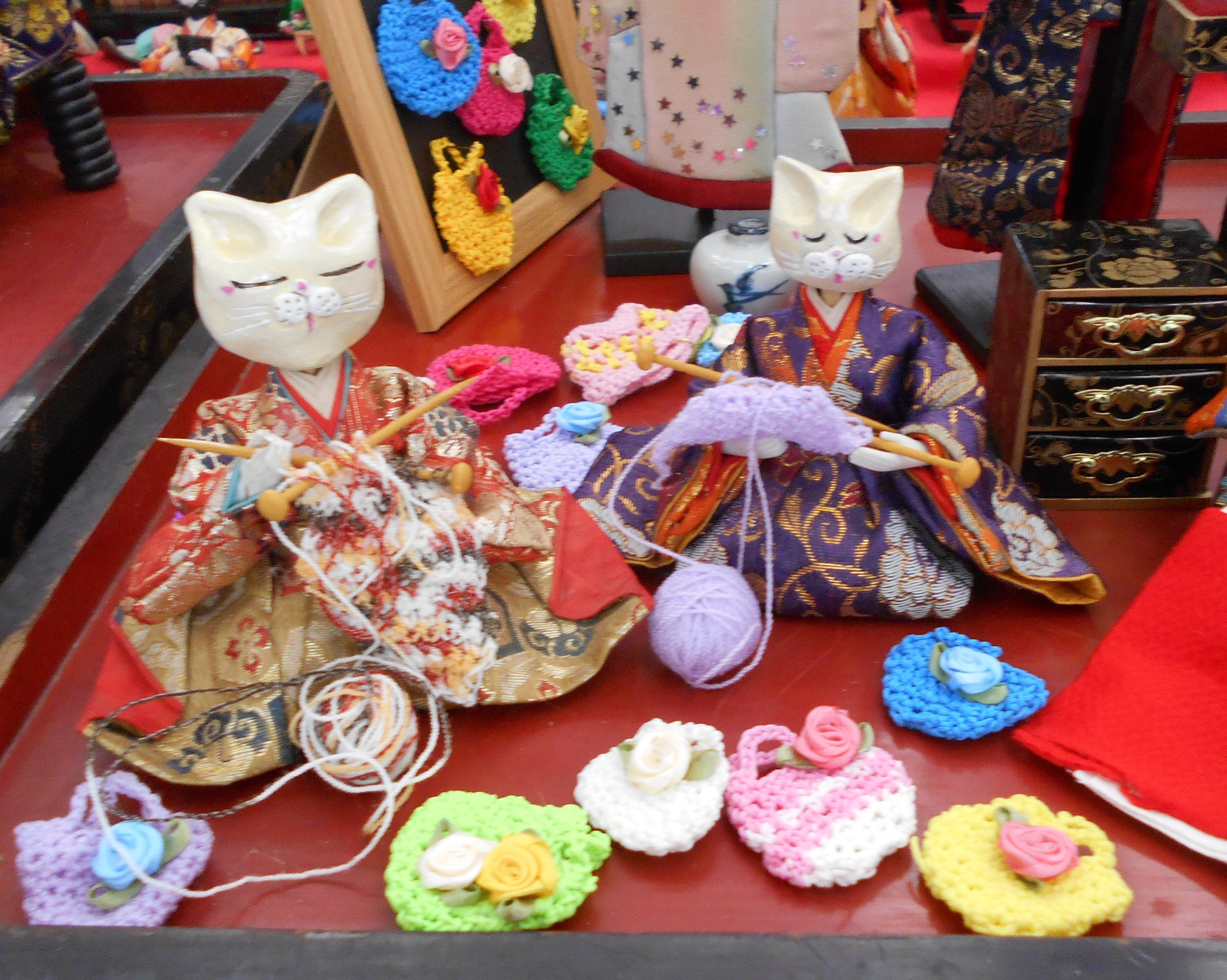 官女さんがニャンコで編み物してる😄沢山の作品ずらりで楽しいです。