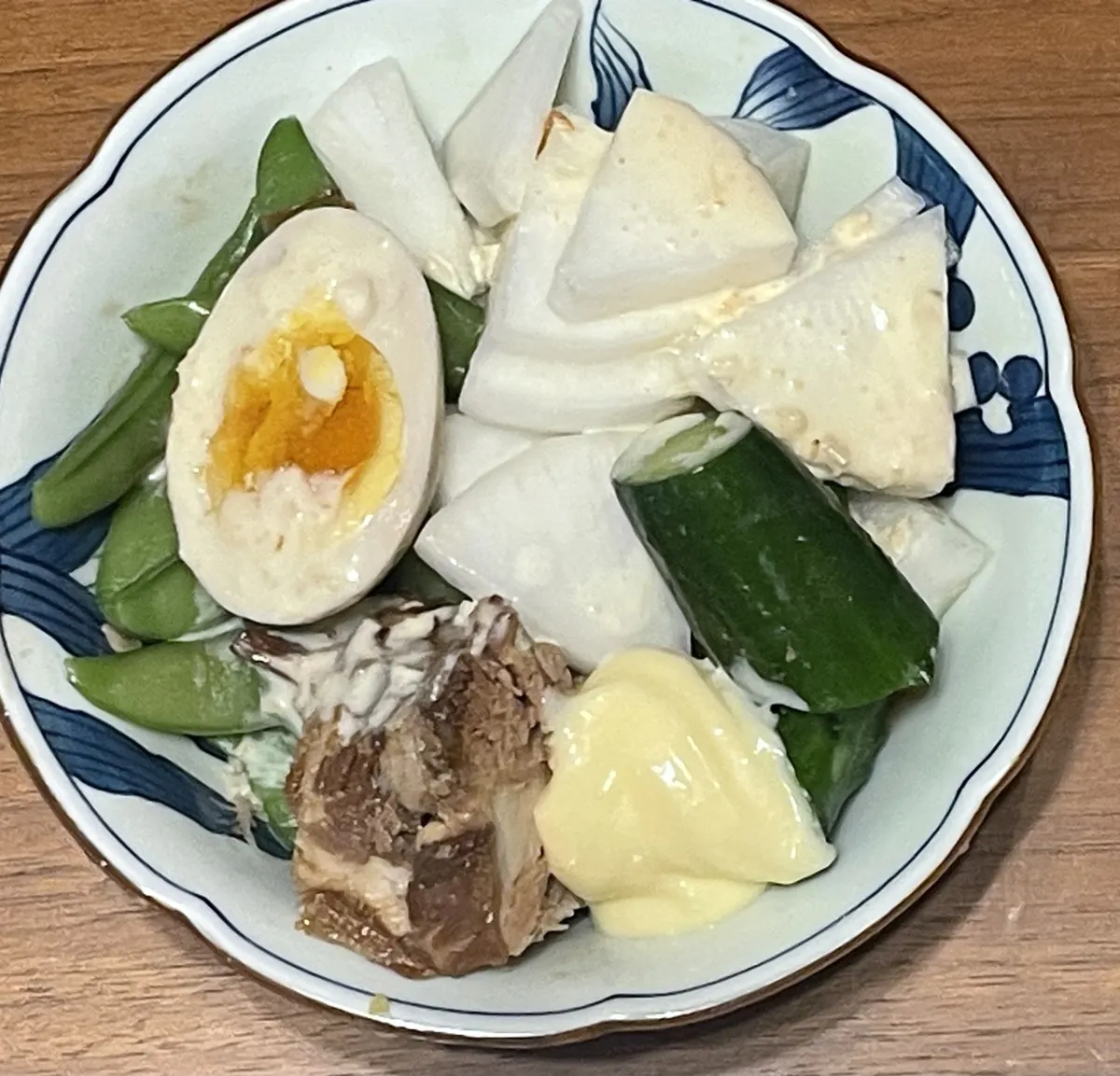 大根・胡瓜・スナップエンドウ・味玉・焼き豚のサラダ🥗