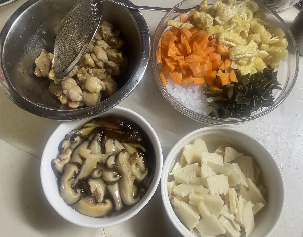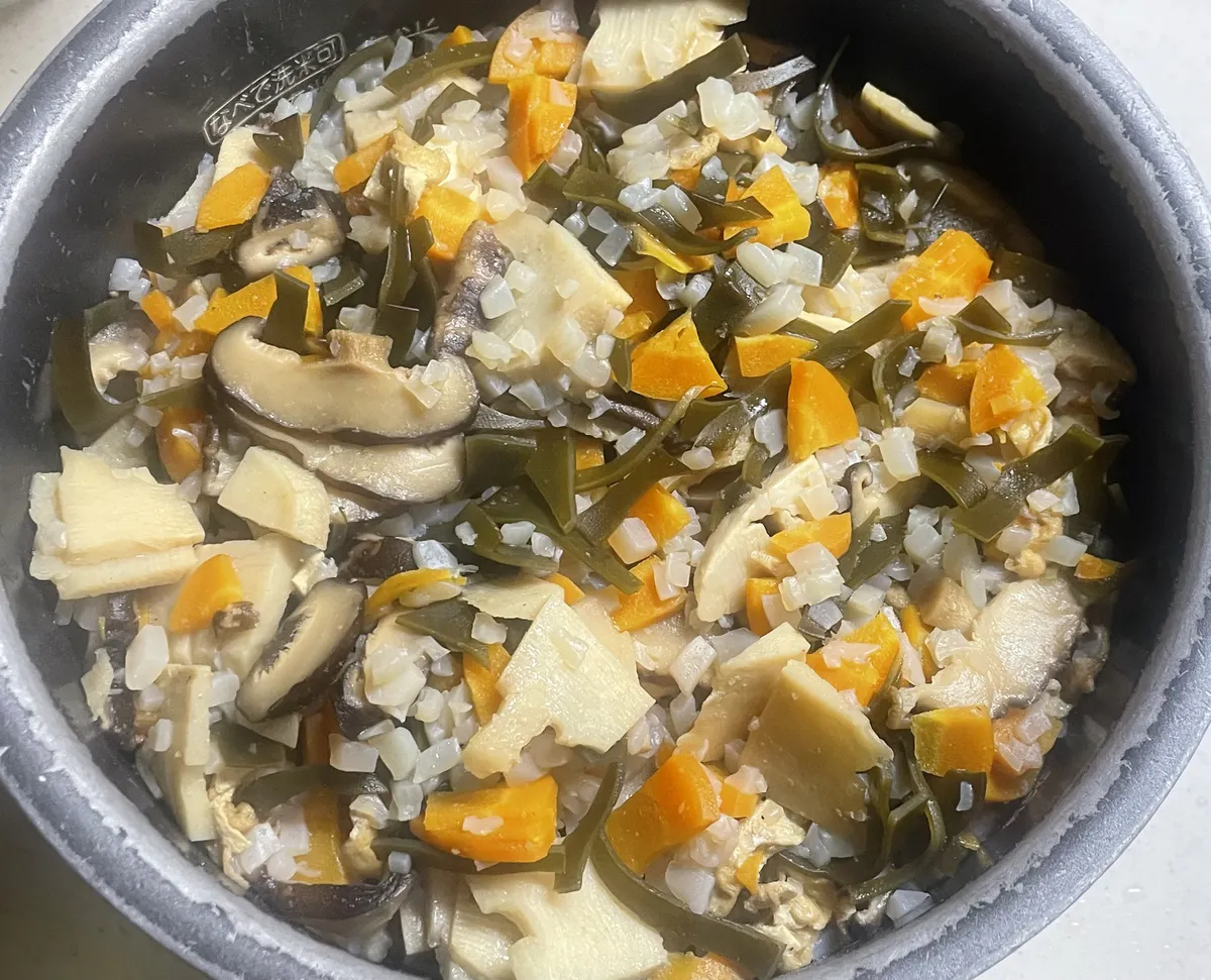①戻し椎茸・筍水煮(半分)・白板蒟蒻(1枚)・人参(1本)・油揚げ・昆布・米(5合&二十五雑穀米)✨