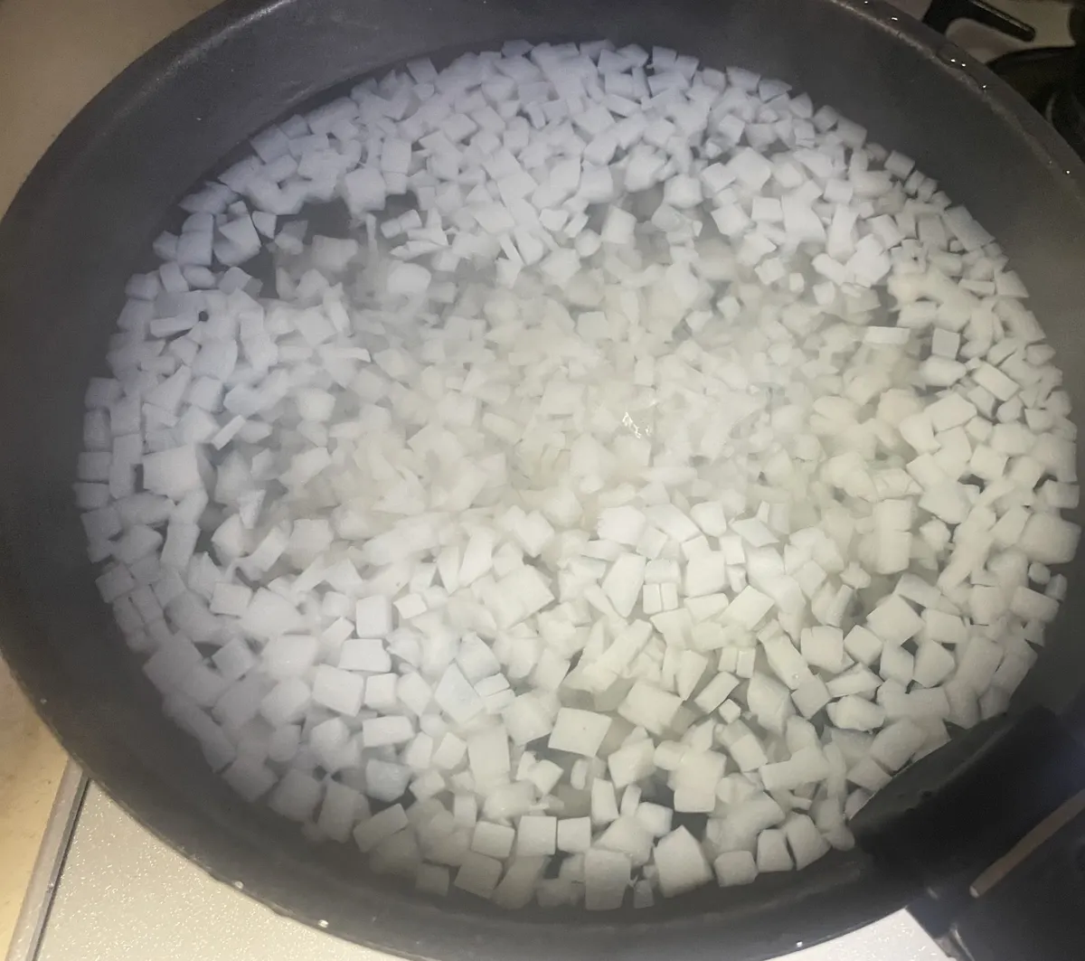 板蒟蒻はお米に化けさせるのが好きなのでめっちゃ微塵切りしてから下茹でぇ〜⬜️🔪💥‼️💨✨