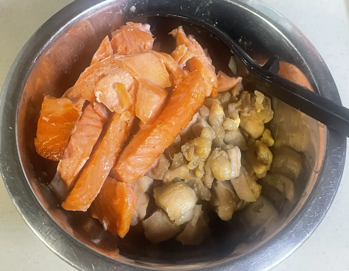 同時作業で鶏もも肉に調味料の塩昆布・金胡麻以外を全て入れ、煮詰まる程度で加熱したのと魚焼きグリルで鮭焼いといたの皮と骨取ったのは別にしとくぅ〜🐓🐟🔥✨