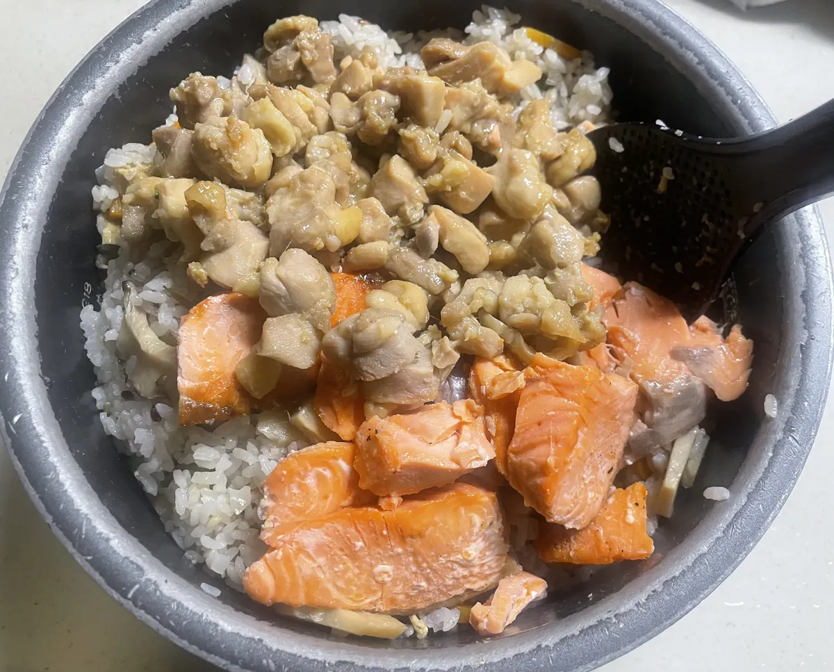 ・普通炊き込みご飯って鶏も鮭も一緒に炊飯器調理にしちゃうのかなぁ〜🤔🐓🐟🍚🔥✨