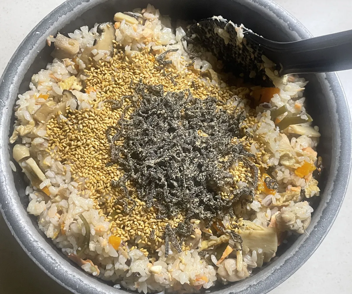 炊けたら鶏・鮭乗せてから15分蒸らし保温🫡⏰♨️✨