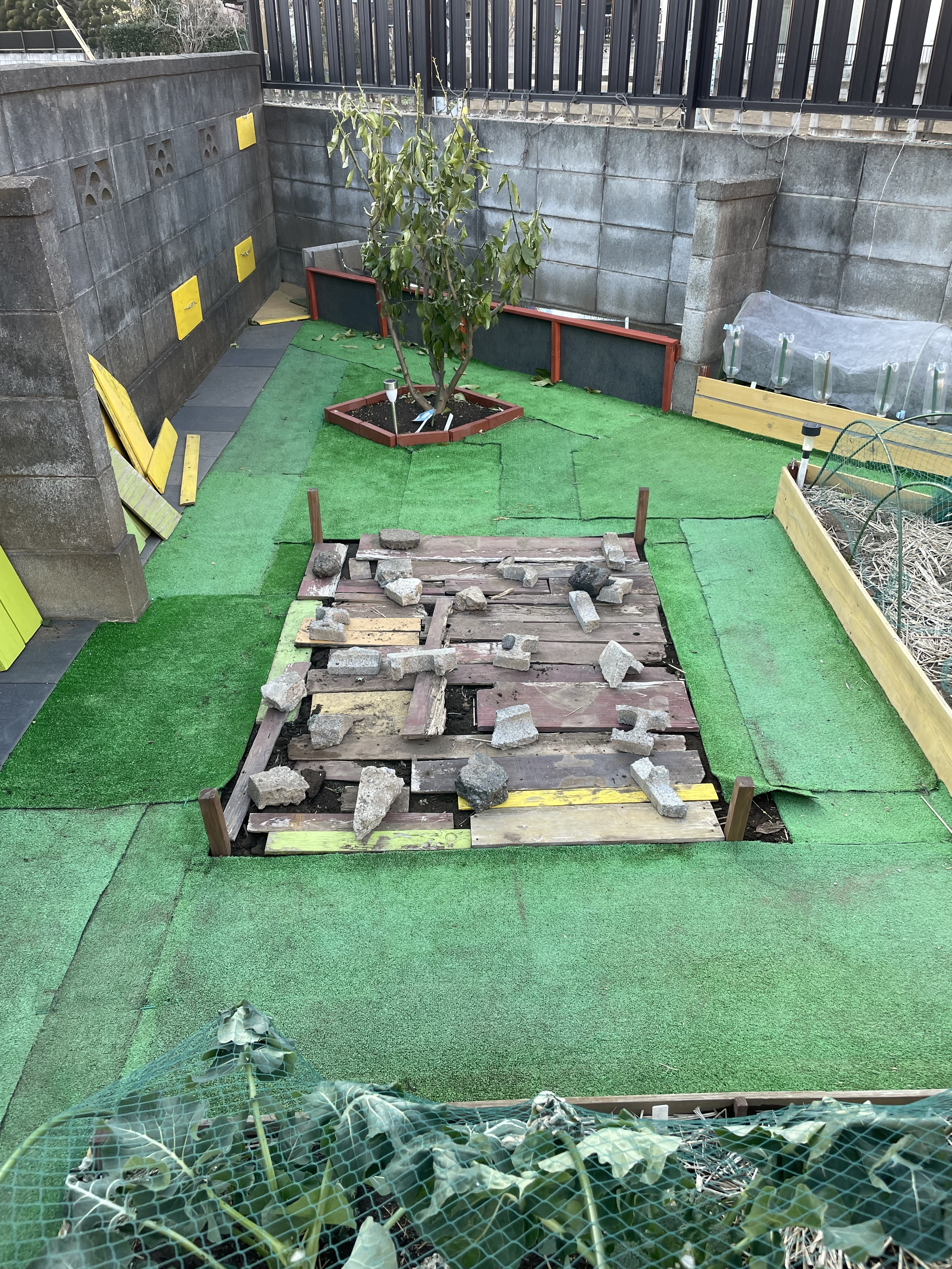 今日のところは、通路幅を決めて杭を4本打っただけですが、人工芝下の土壌が凍ってて結構な作業になってしまいました。