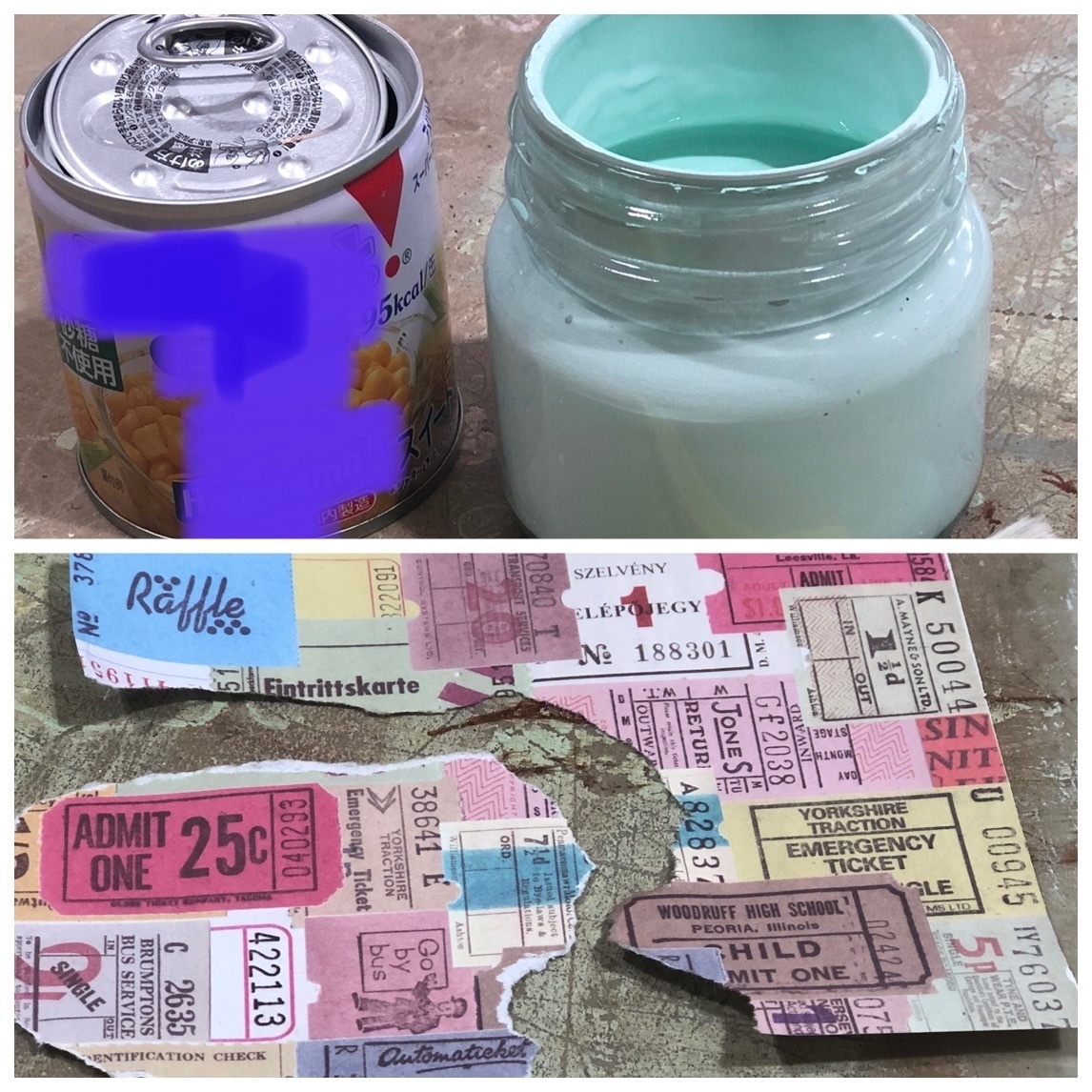 ドライヤーで乾燥させたら、好きな柄の紙を選んで缶の大きさに合わせて✂️でカットしても手でちぎって🆗。デコパージュ液を塗ったら紙を貼付け、更に液を中心から外に向かって筆で塗ります😍✨