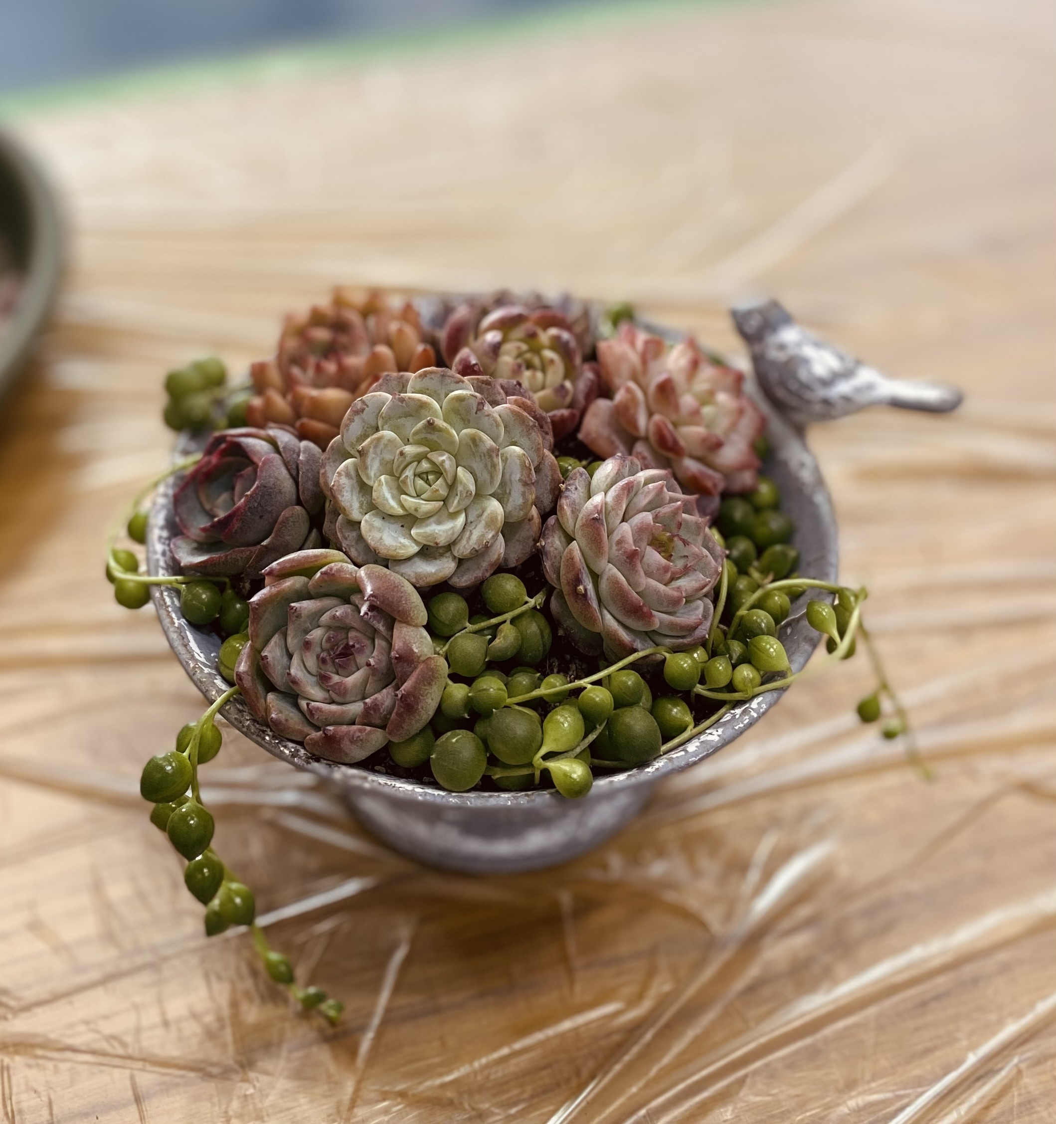 ステキなバードカップにネルソルをのせ、可愛いエケベリアさん達を置いていきます🥰