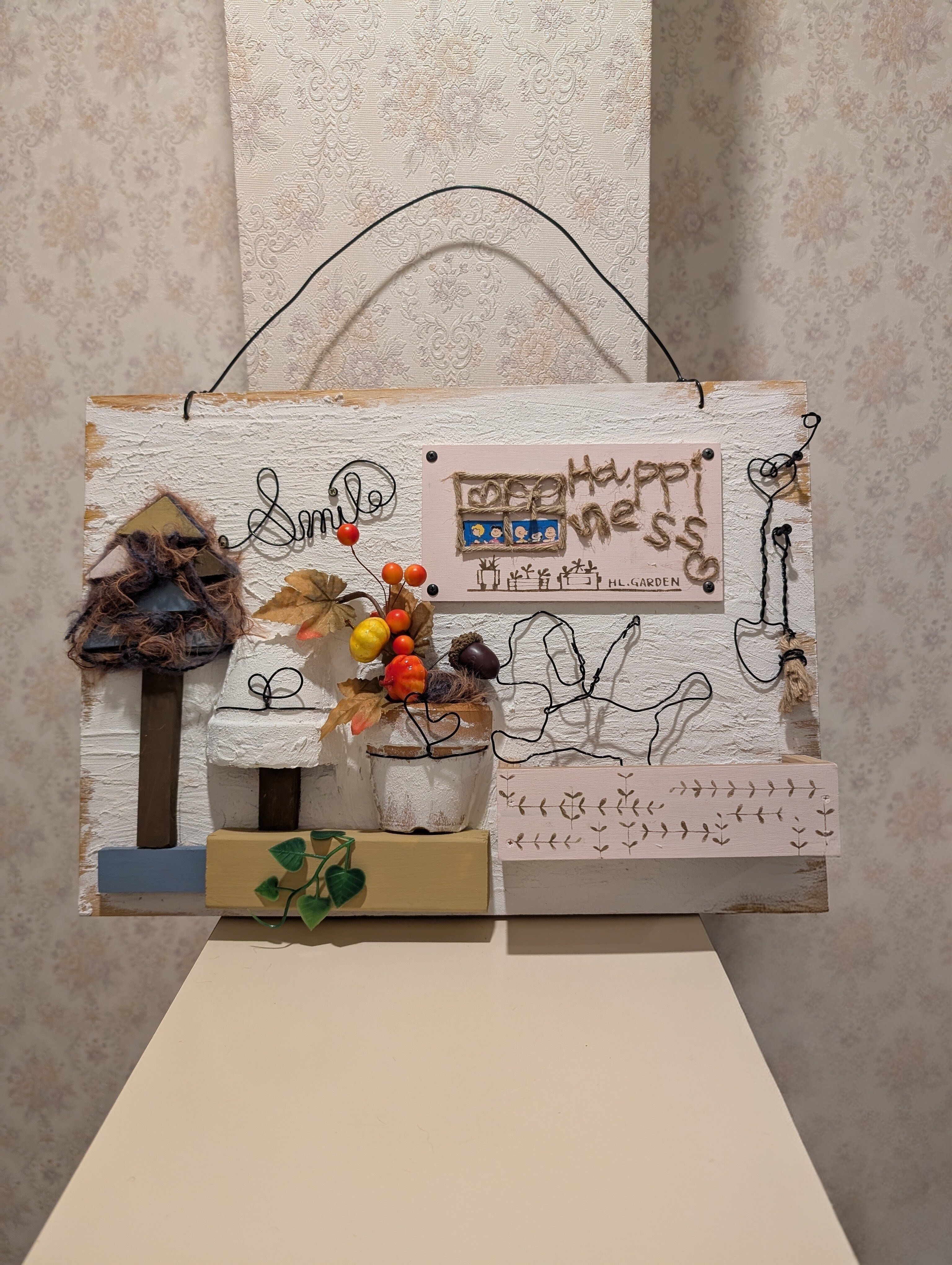 三角にカットした木材に毛糸を引っ掛けて紅葉した葉っぱの感じを出したかったですが、毛糸が暗すぎました🍂🥲