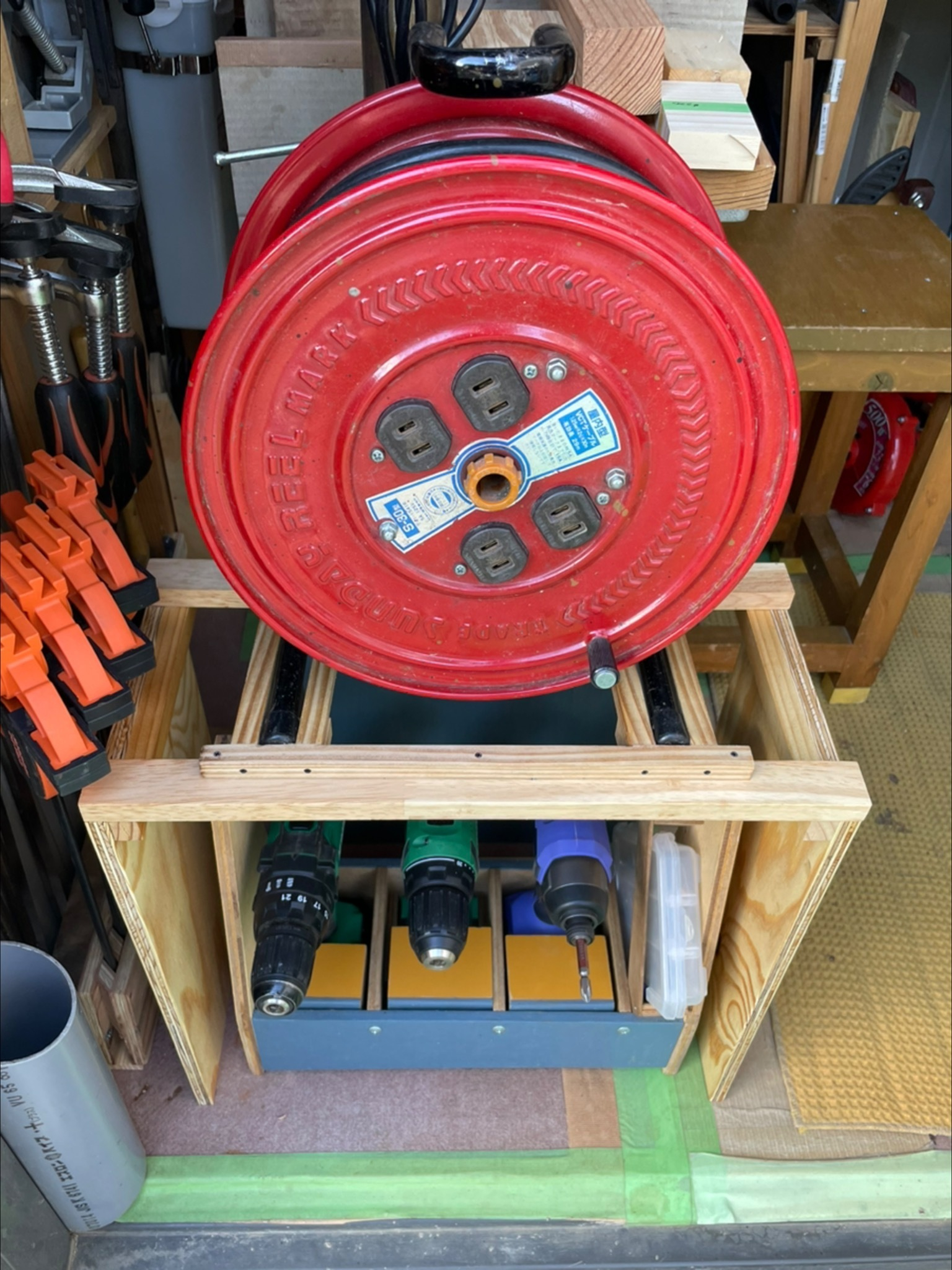 屋根のない我が青空工房では、電工ドラムで電源を引くところからスタートします。使用頻度が高い割に、置き場が決まってなくて、あっちこっちとしてたので、電動ドライバー収納と一緒にスタンド化して、使い勝手を考えました。物置きのドア付近に設置したのもアイデアです。