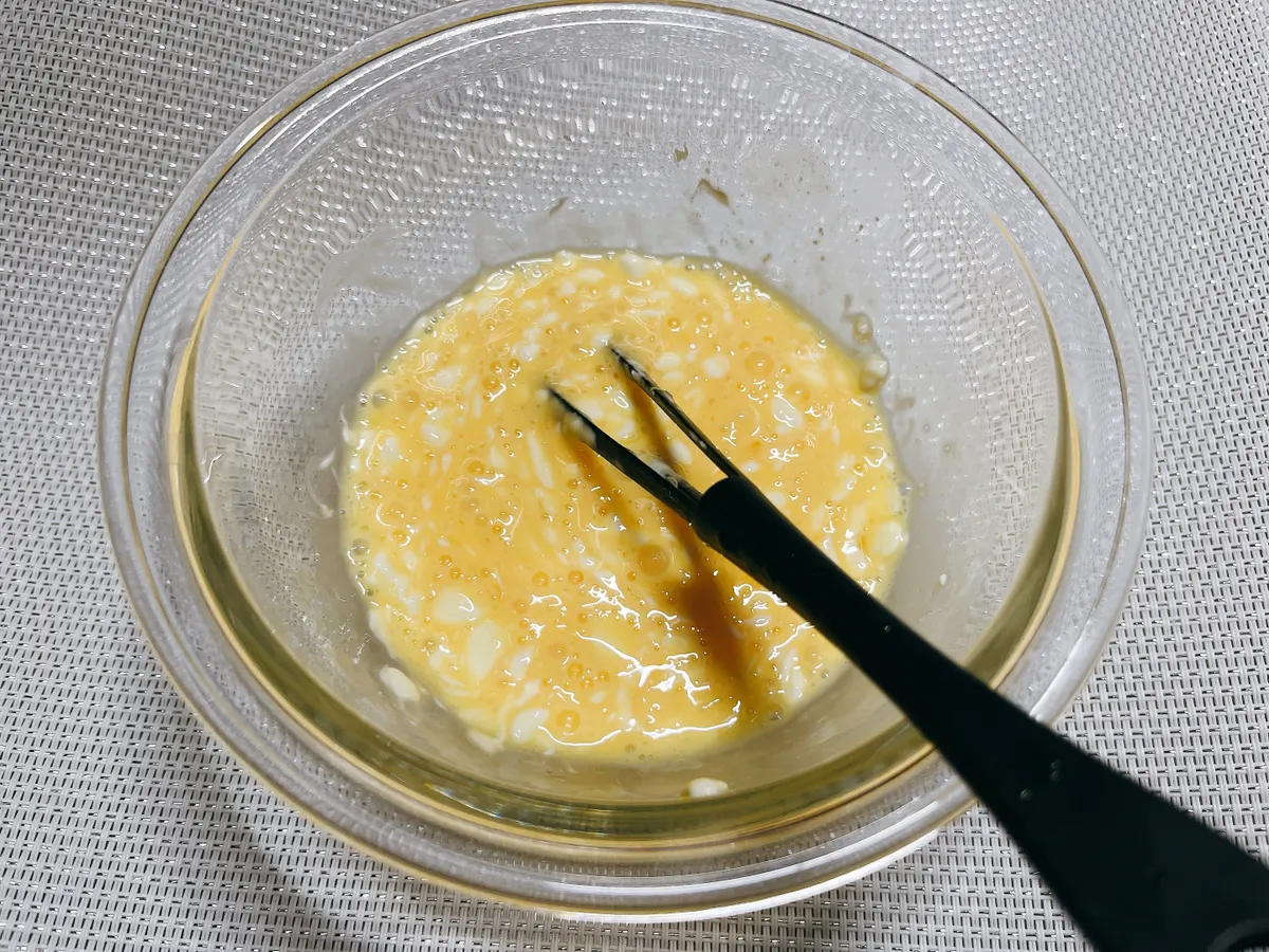 温めた牛乳の半量を、卵液にいれ混ぜ合わせます。