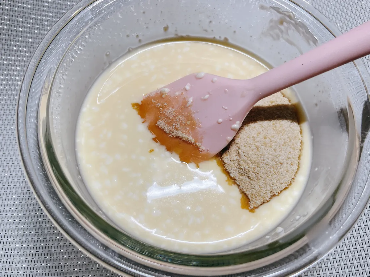 もう半量を入れ、きび砂糖を加えて混ぜ合わせます。