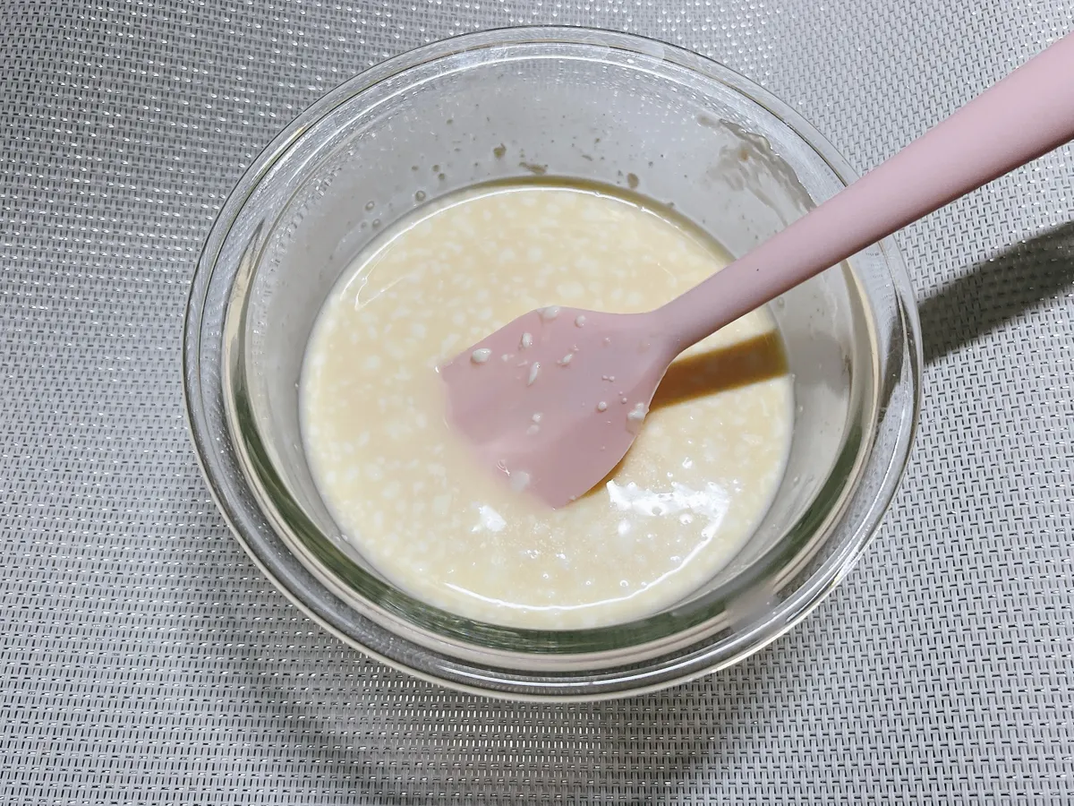 茶こしに残ったクリームチーズは、プリン液にヘラで混ぜ合わせて加えます。