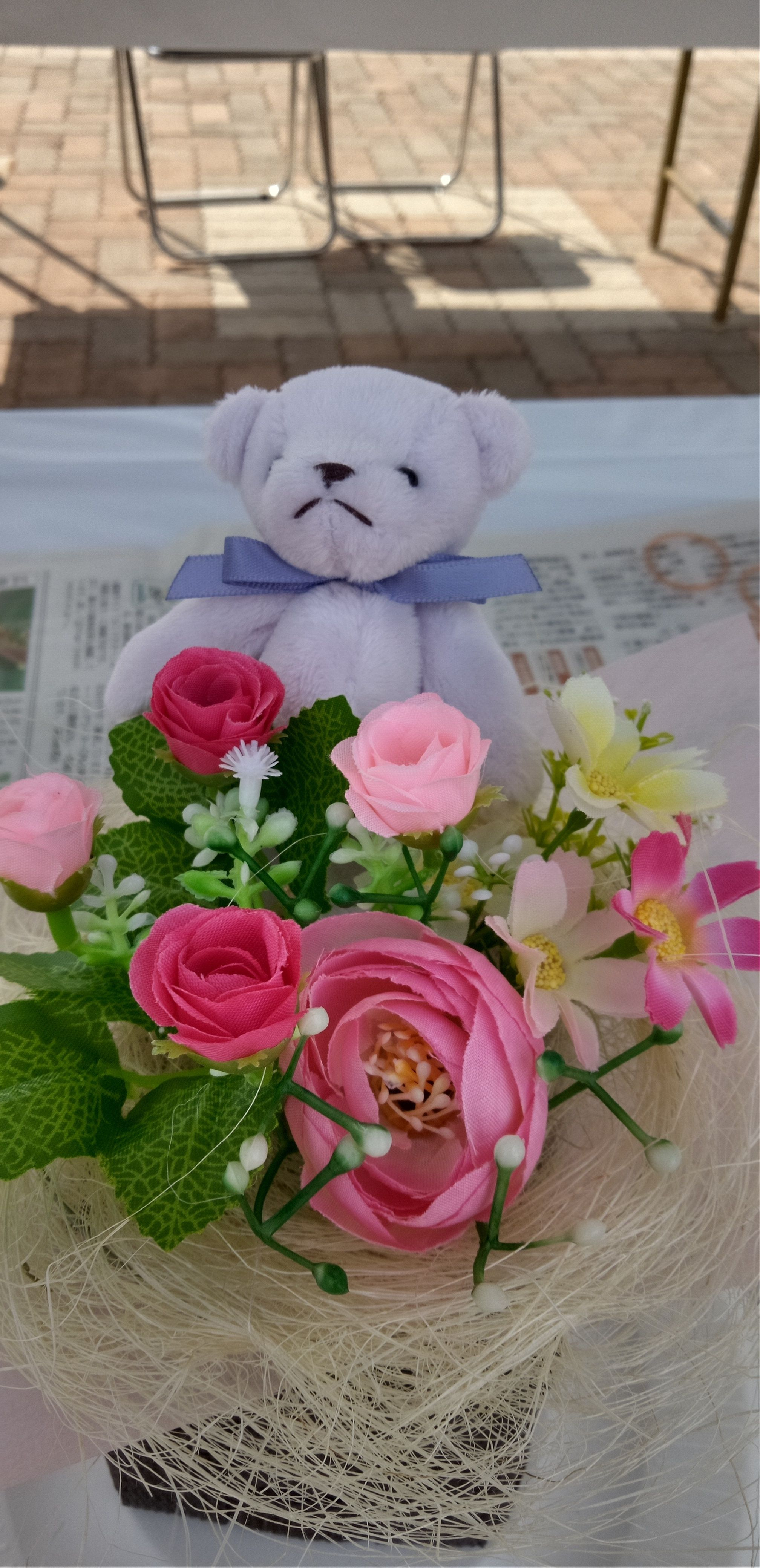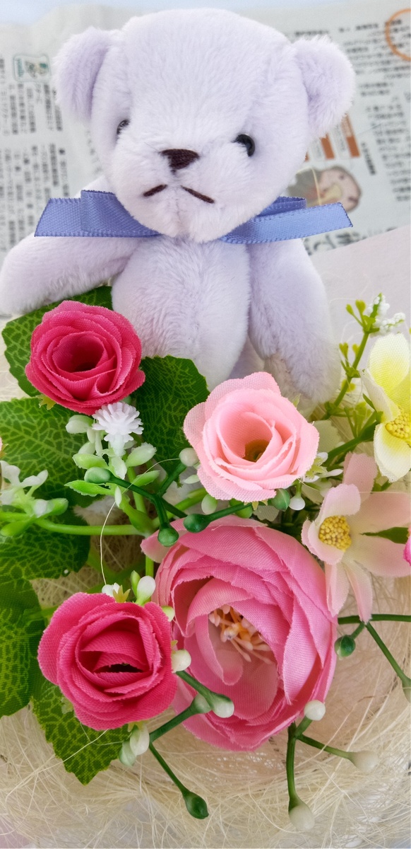 くまちゃんの水色リボンとピンクのお花の色の組み合せ、好きです🥰