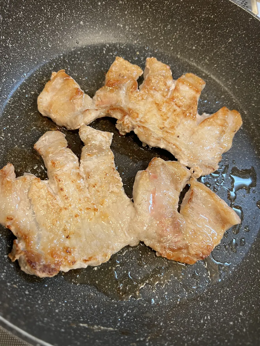 ③豚肉を筋切りして、叩いて グローブのように切れ目を入れて塩コショウして、うっすらと小麦粉を振っておく。