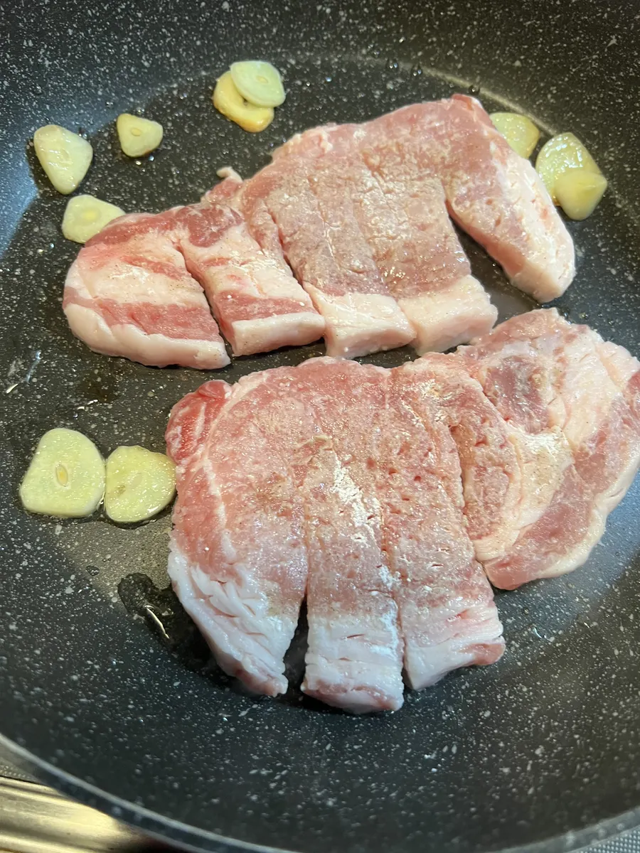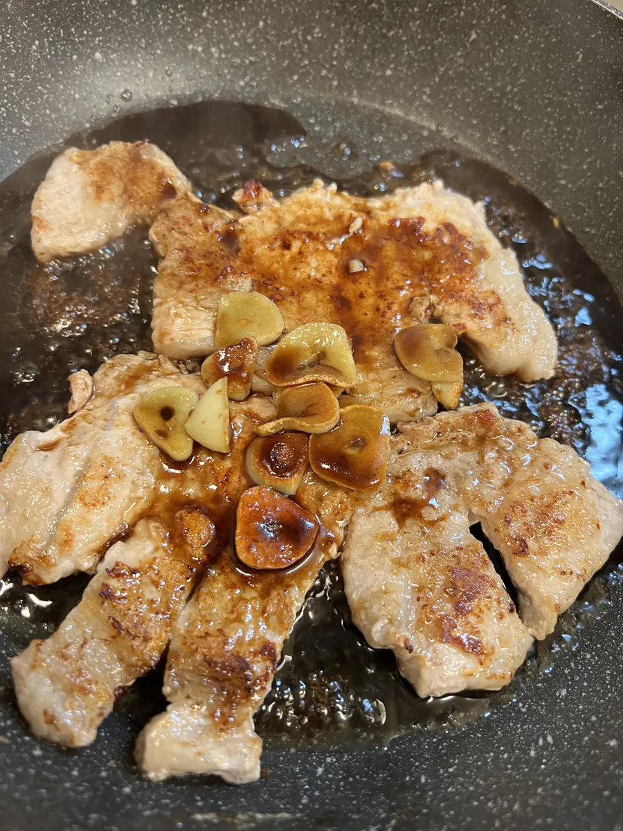 ④フライパンを熱してサラダ油を引き、ニンニクを焼いて香りを移して③の豚肉を入れて片面ずつこんがりと焼く。