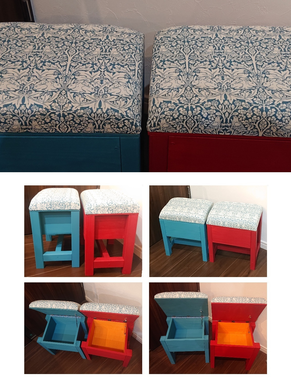 ようやく収納付きスツール(レッド)が完成しました♪最初はオレンジだったんですけど、2つ並べてみると、何だか違うなー🤔💭ってなって🤭上からレッドを塗りました♪
