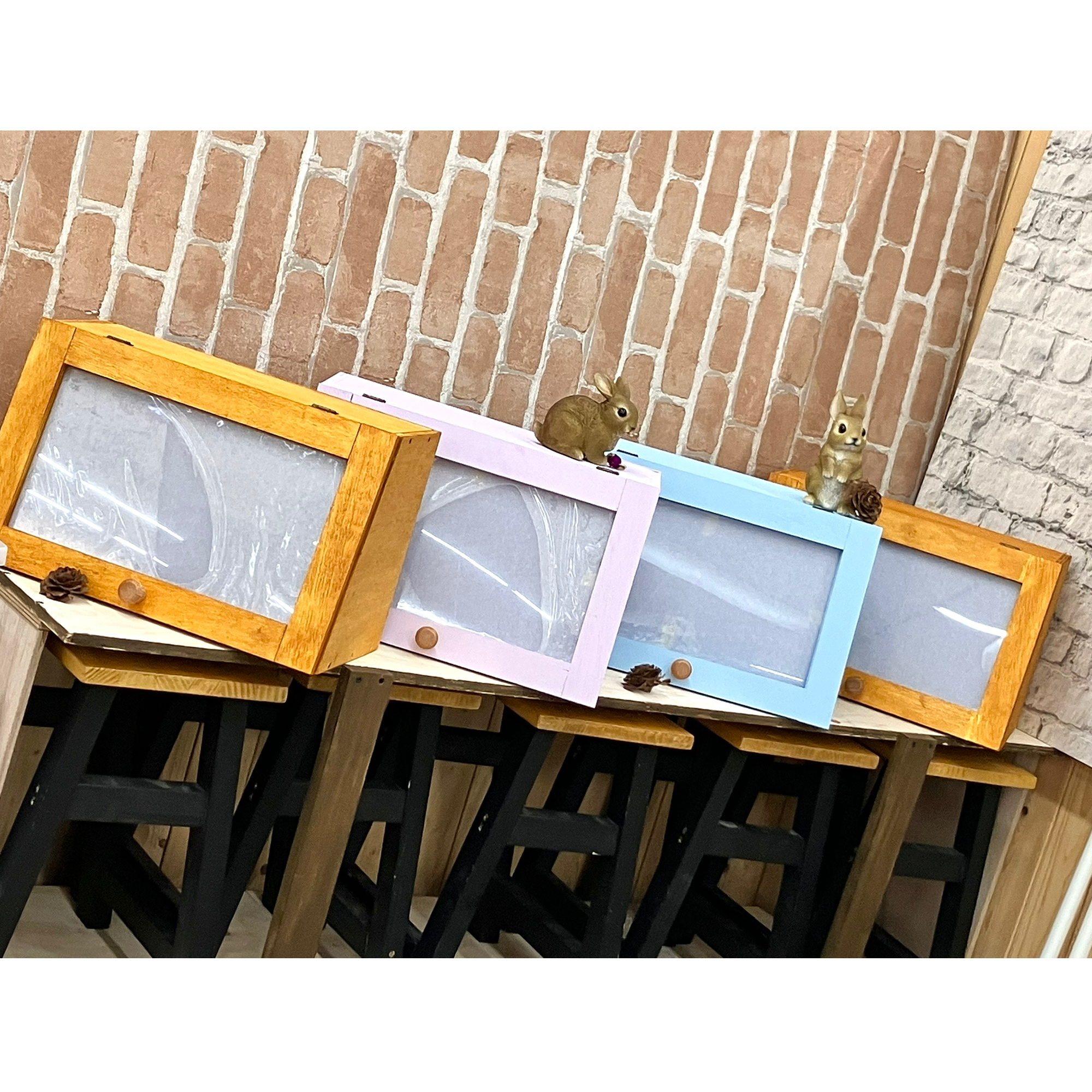 念願のカフェ風ショーケース🪚ようやく作ることができました。今回は、室内で馴染みやすいメープルに塗装。パステル系の作品と並ぶと、明るい気分になるピンクやブルーも魅力的でした✨