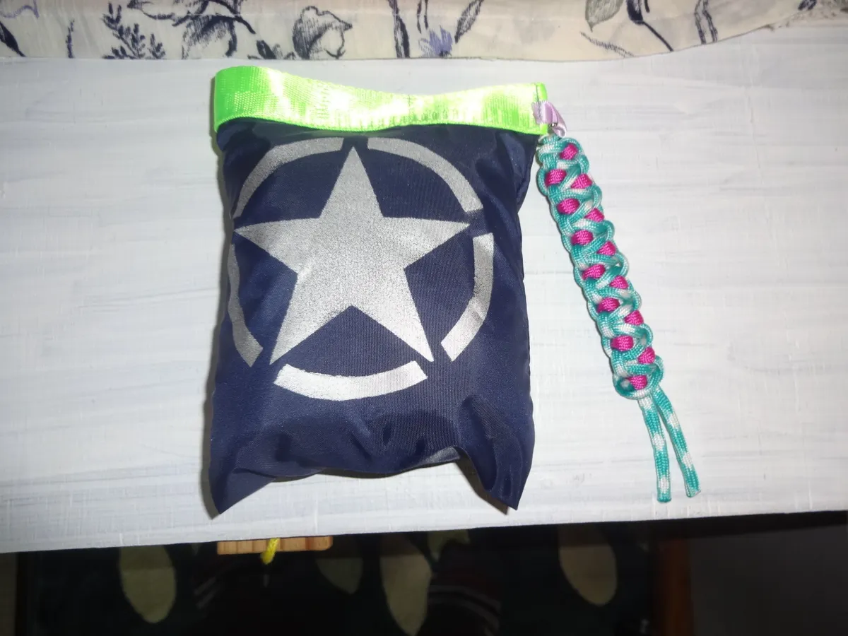 ↓紺のハギレで折り畳み収納袋も。(収納された画像)10×15cm