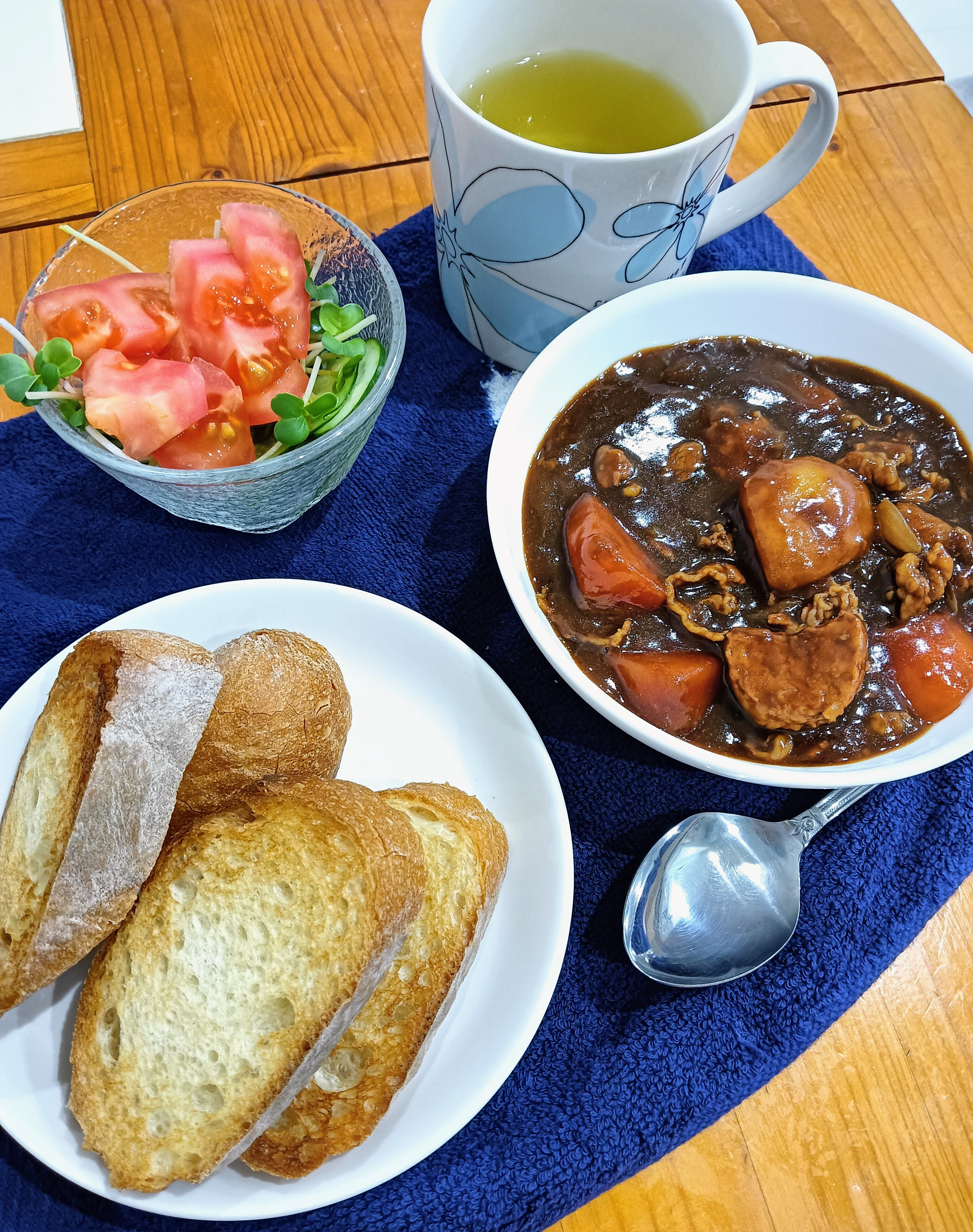 ビーフシチューに焼いたバケット🥖をつけパンして食べるなんて最高です❗️