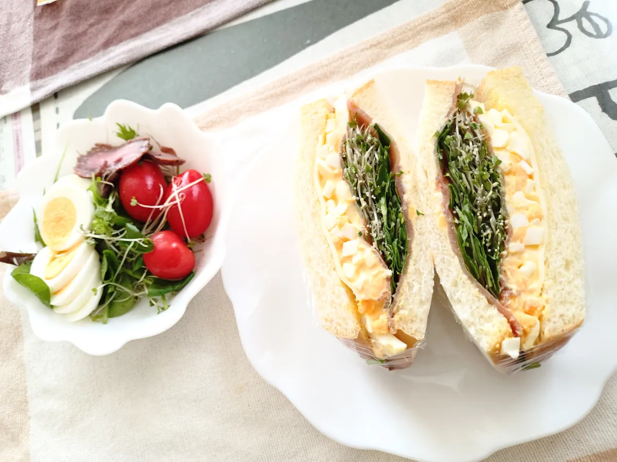 サラダ🥗と茹で卵入りボリュームサンド🥪生ハムとベビーリーフ、ブロッコリースプラウト入り🩷