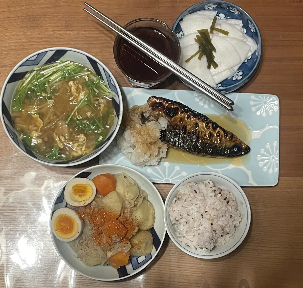 蕪の千枚漬け(お買得品👛✨)・鴨鍋のリメイク最終形態汁・焼き鯖の鬼下ろし柚子ポン酢添え・二十五雑穀米📸✨