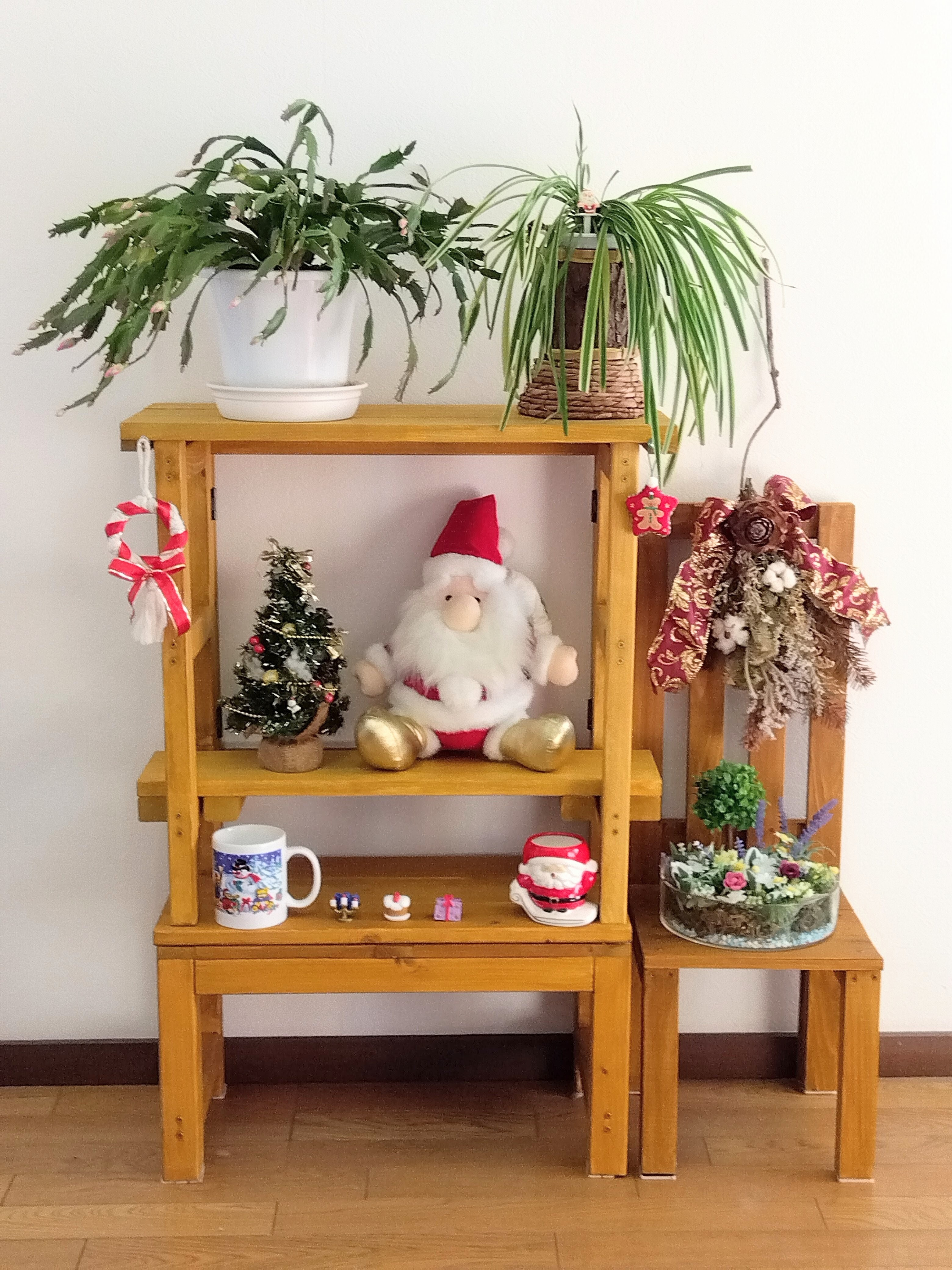 折りたたみ2段シェルフにクリスマスの飾り付けをしようとし以前作ったミニベンチロングに乗せてみたらピッタリサイズでした😊🎶