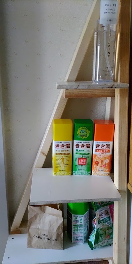 トップ > その他 > 入浴剤置き場 ミッティ 2022/01/29 13:19 入浴剤置き場 日替わりで入浴剤を使っているので風呂場入り口に置いてるスペースが圧迫してきました。 なので以前のボックス型3段シェルフの時に学んだやり方を応用して、その上に乗せる形の棚を用意。 ホワイトウッドの垂木(30*40)以外は端材です。 塗装なしカフェブリッコの紙袋は散らばってた貰い物の入浴剤詰め込みました。 紙コップも洗って小物入れとして再利用すればよかった…😂 いいね 共有する 共有する X LINE リンクをコピー コメントする 1 件の返信 (新着順) ミュートしたユーザーの投稿です。 投稿を表示 くぅ6233 2022/01/30 08:26 入浴剤 種類が沢山あって あれこれ試したくなりますよね😃 きき湯も使っています👌 ドラッグストアのクーポンが出るとクナイプを購入します🎵とても香りが良く て体も温まります いいね 返信する