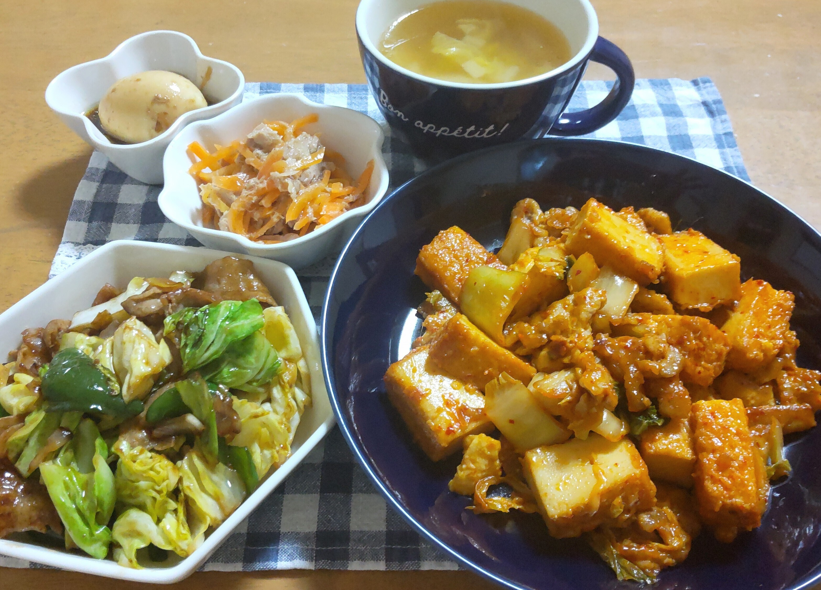 ネットレシピを参考にしました。豚こまと厚揚げをキムチ炒めにして、ピザ用チーズの代わりにとろけるチーズを加えました。