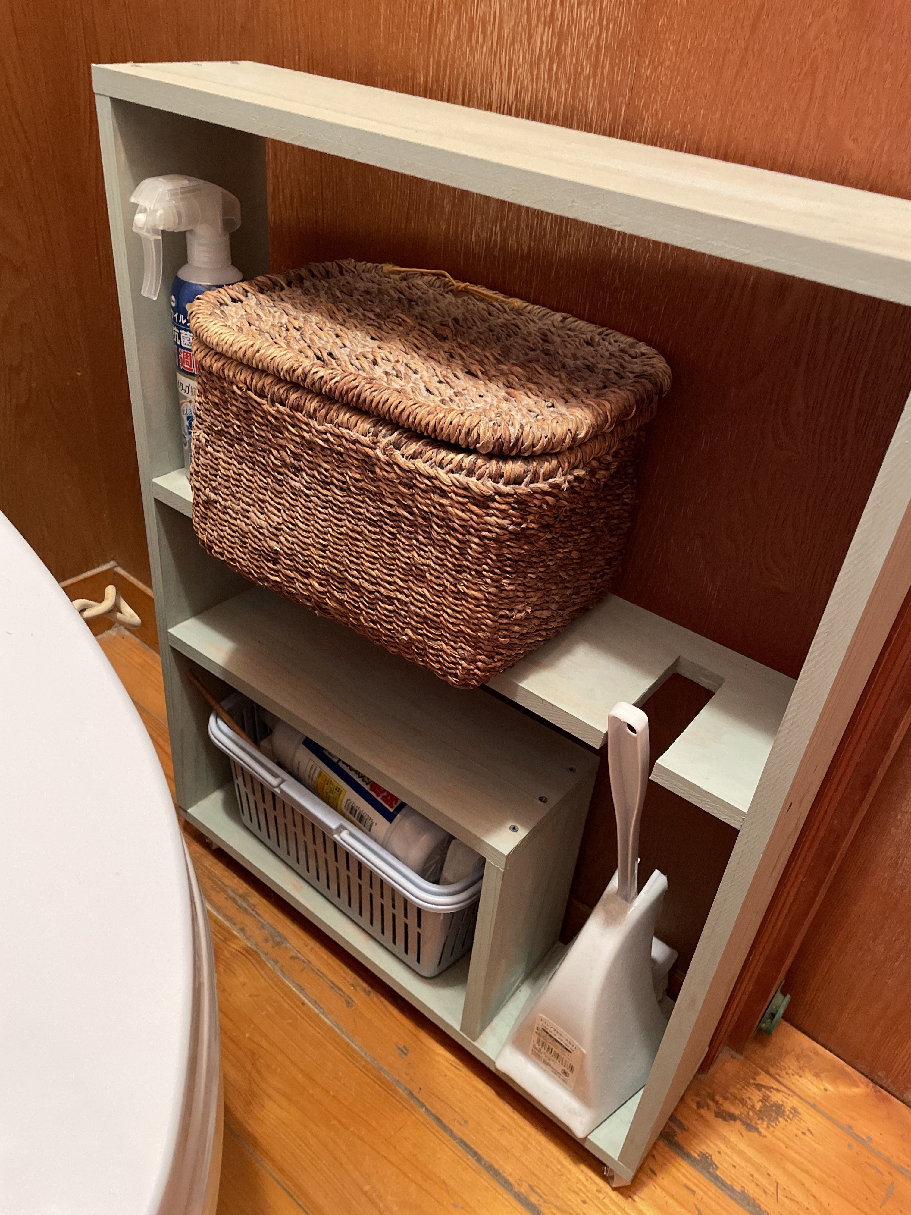 やっと我が家にもトイレ収納シェルフきました!ペパーミントの塗料も木目が出ていい感じに仕上がりました。