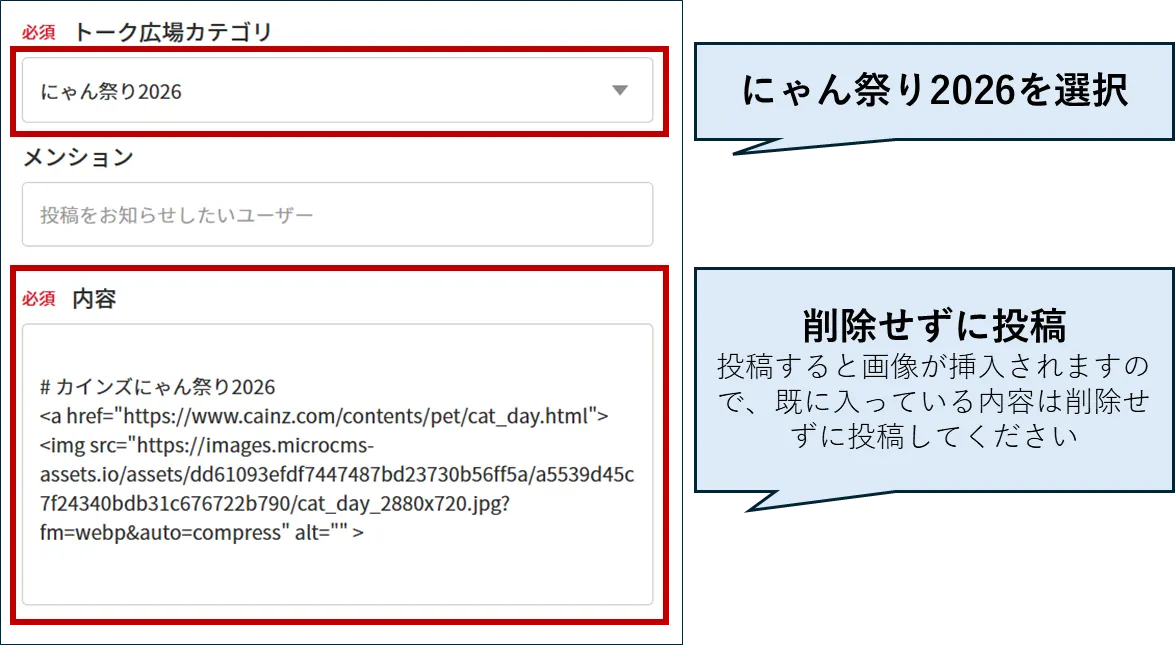 ※既に「内容」に記載されている文字は削除せずにその上に内容を入力し投稿してください。(記載されているコードを入れて投稿することでにゃん祭りの画像とリンクが挿入されます)